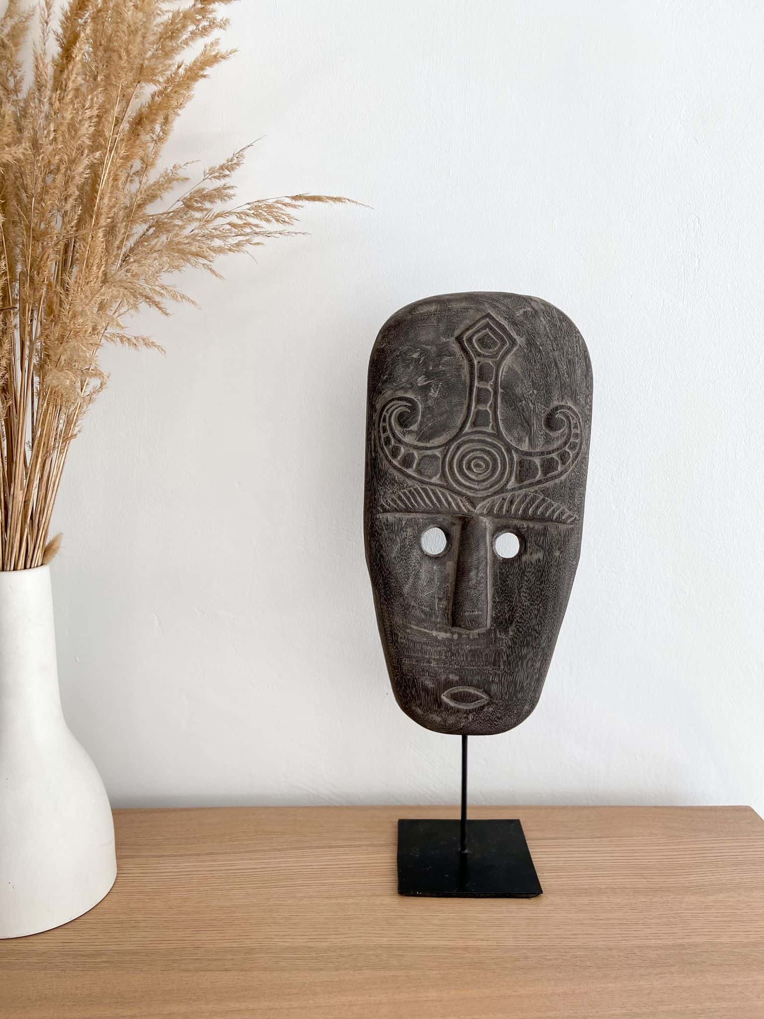 This mask, with its intricate design, is complemented by a metal stand, making it perfect as a free-standing decoration in your home. It is a perfect example of ethnic style, which combines natural materials with Oriental accents.