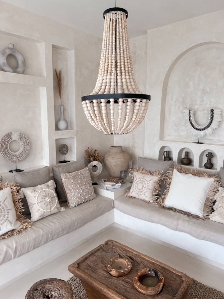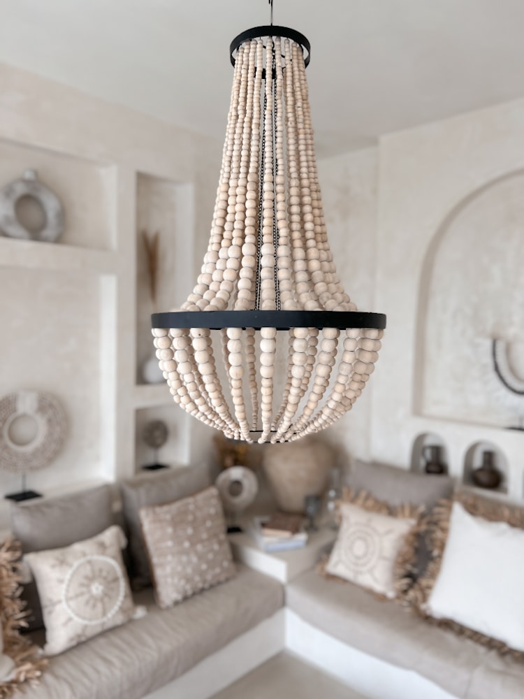 The Beaded Boho Chandelier ARI is an earthy ceiling light crafted with layered wooden beads. It brings playful movement and natural texture to dining rooms, bedrooms, or cozy cafés.