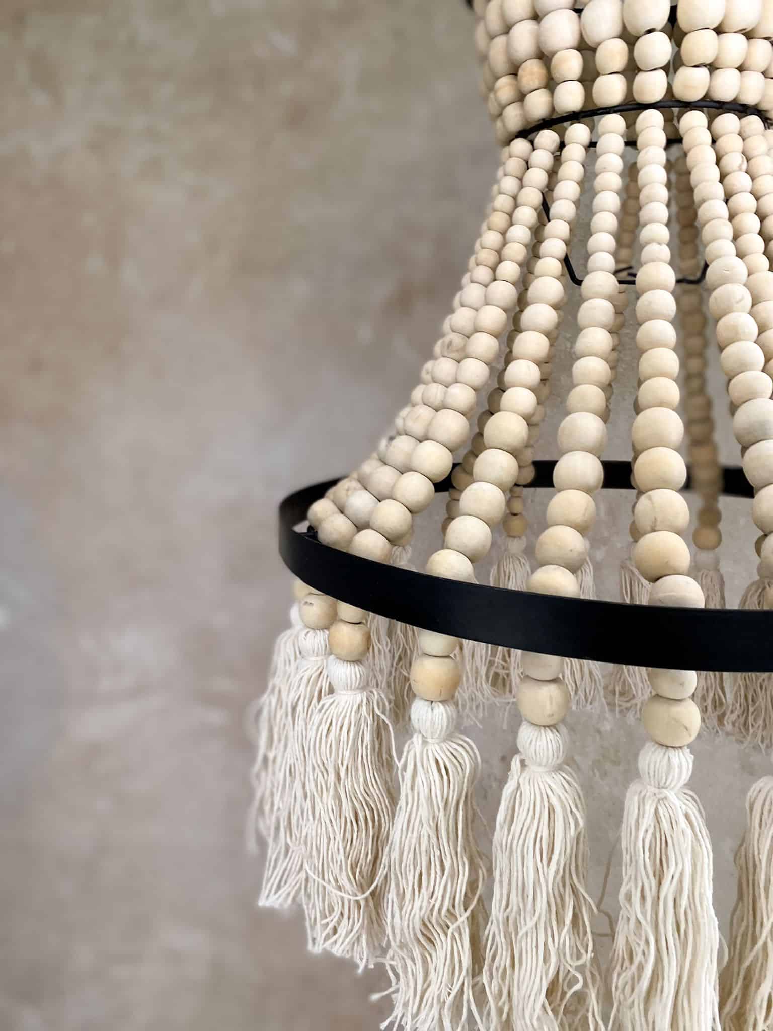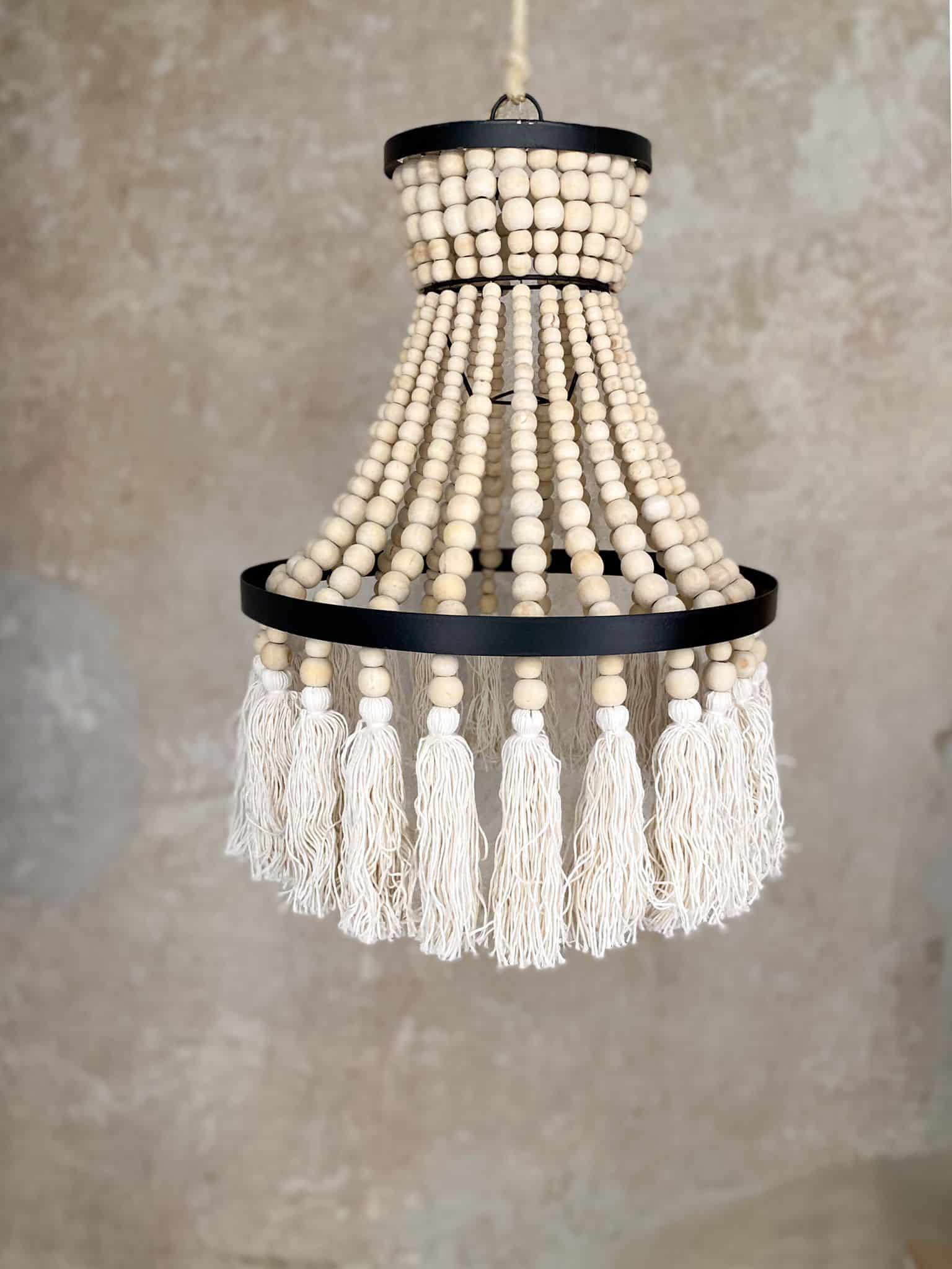 The Beaded Boho Chandelier RAYA is a compact yet eye-catching hanging light made from hand-threaded wood beads. Its flowing tiers create soft shadows and a laid-back rhythm in any space.