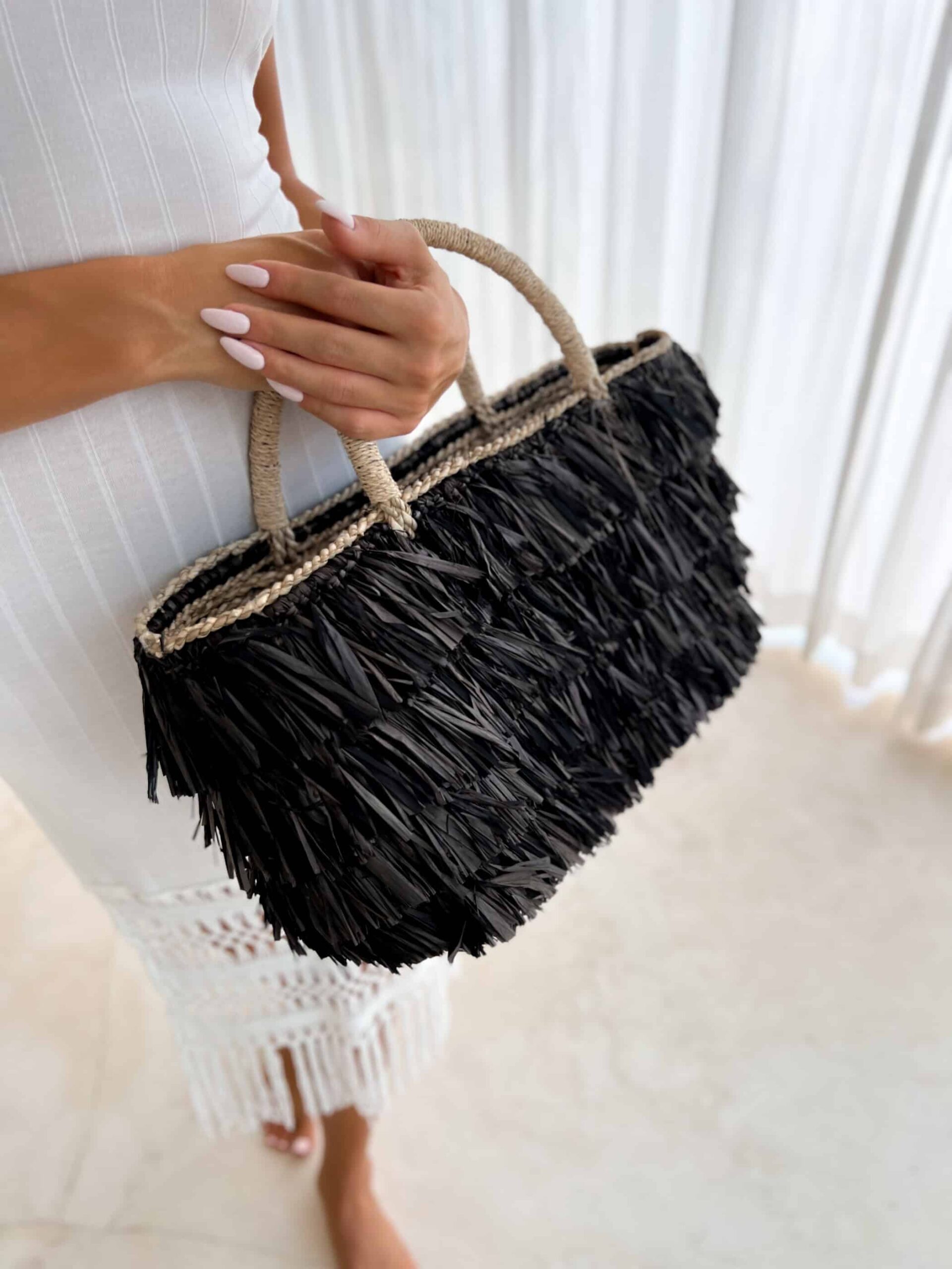 Description: Black raffia fringe basket bag in boho style