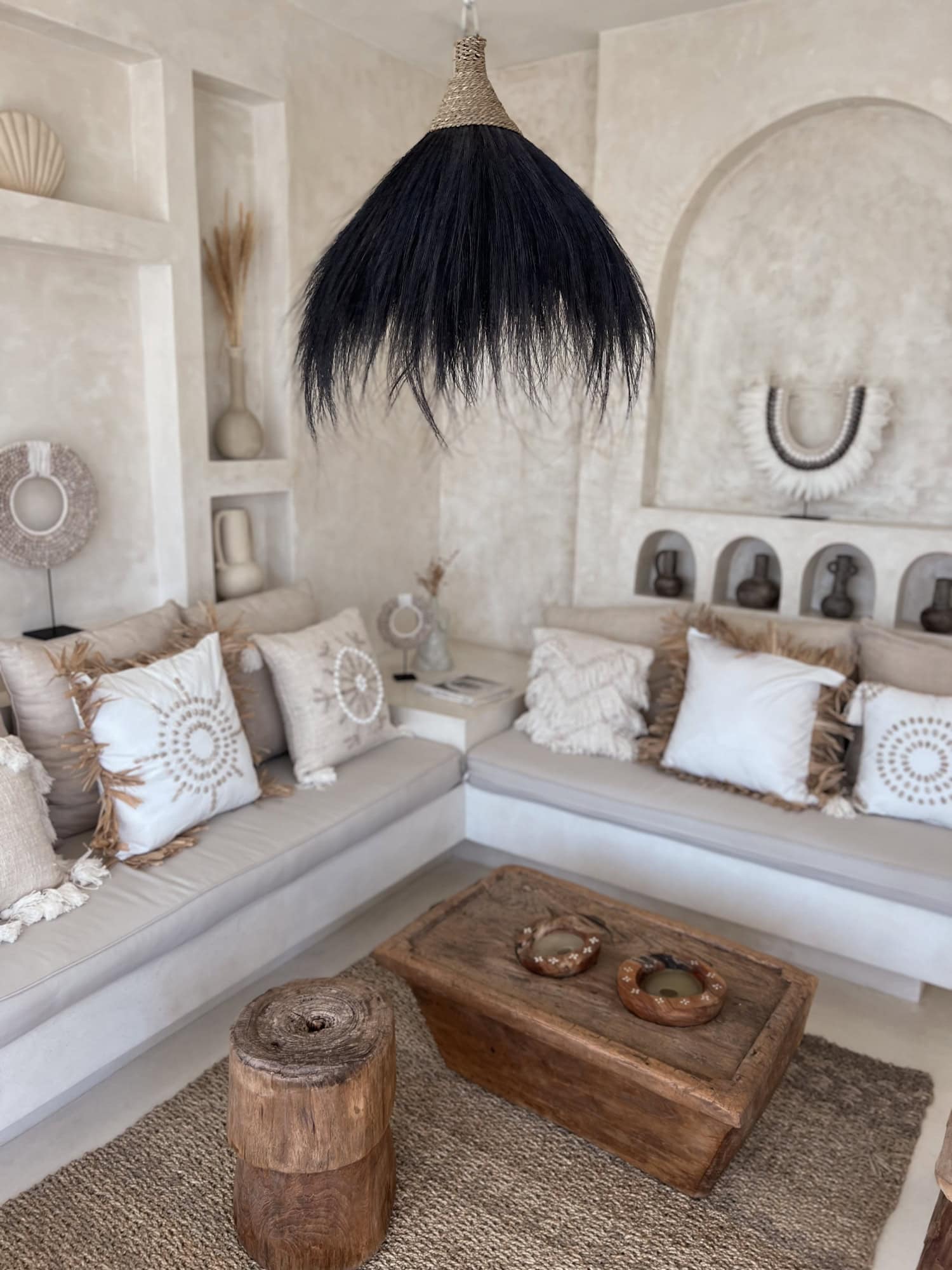 The Black Boho Rattan Pendant Light RIMBA offers a striking contrast of dark texture and soft light. With its tall, elegant silhouette, it suits high ceilings or cozy rooms needing a modern boho twist.