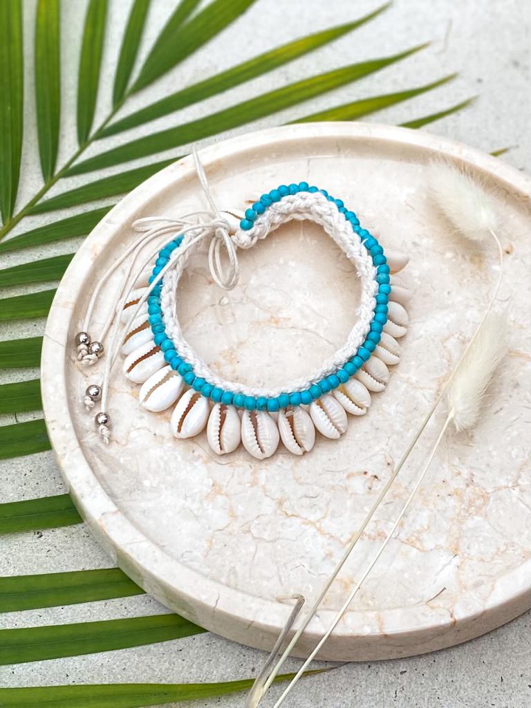 The Blue KELAM anklet is a summer must-have — playful, handcrafted, and full of coastal charm. With natural kauri shells, sky-blue beads, and a soft cotton band, this boho beach anklet brings the sea to your ankles.