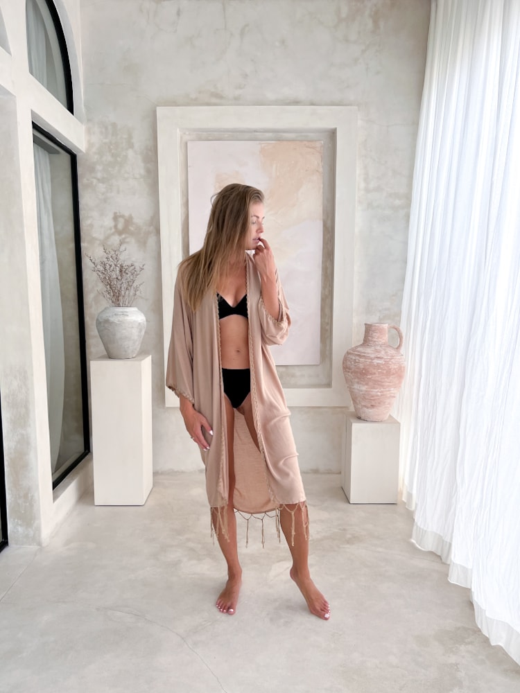 The Boho Beach Cover-Up ARIS Beige is a soft and breathable nude-toned summer kimono crafted in a small workshop in Bali. Made from airy rayon fabric, this boho beach cover-up is designed to offer light protection from the sun while keeping you cool and comfortable.