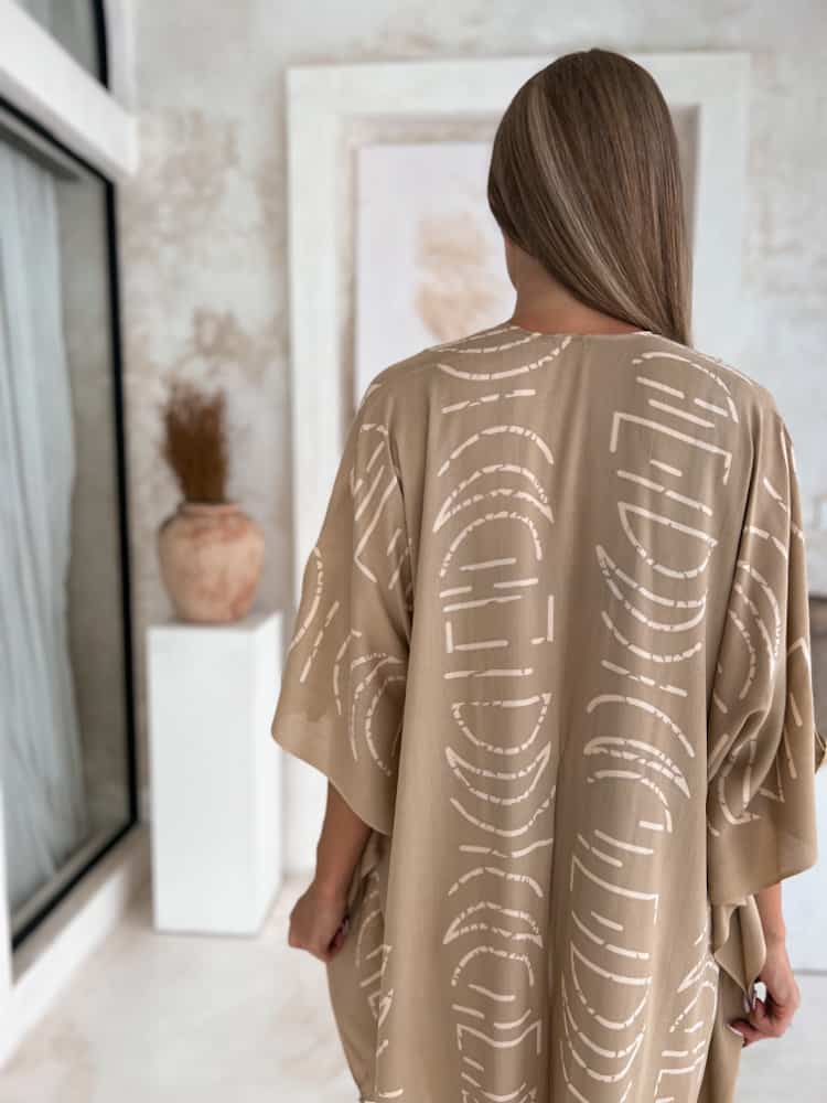 The Boho Beach Cover-Up MOON Beige is your barefoot invitation to slow mornings by the ocean and sunlit afternoons. Flowing gently around the body, this beige boho kimono is crafted from breathable rayon and finished with soft fringe that sways with every step.