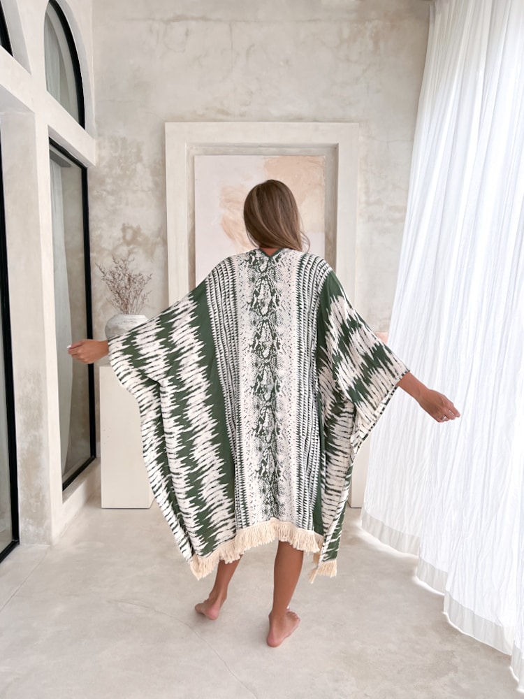The Boho Beach Cover-Up NELI Green is a breathable and lightweight summer kimono designed to offer effortless coverage on sunny days. Handcrafted in a family-run workshop in the heart of Bali, this green boho wrap flows gently over the body, keeping you cool and protected from sun and wind.