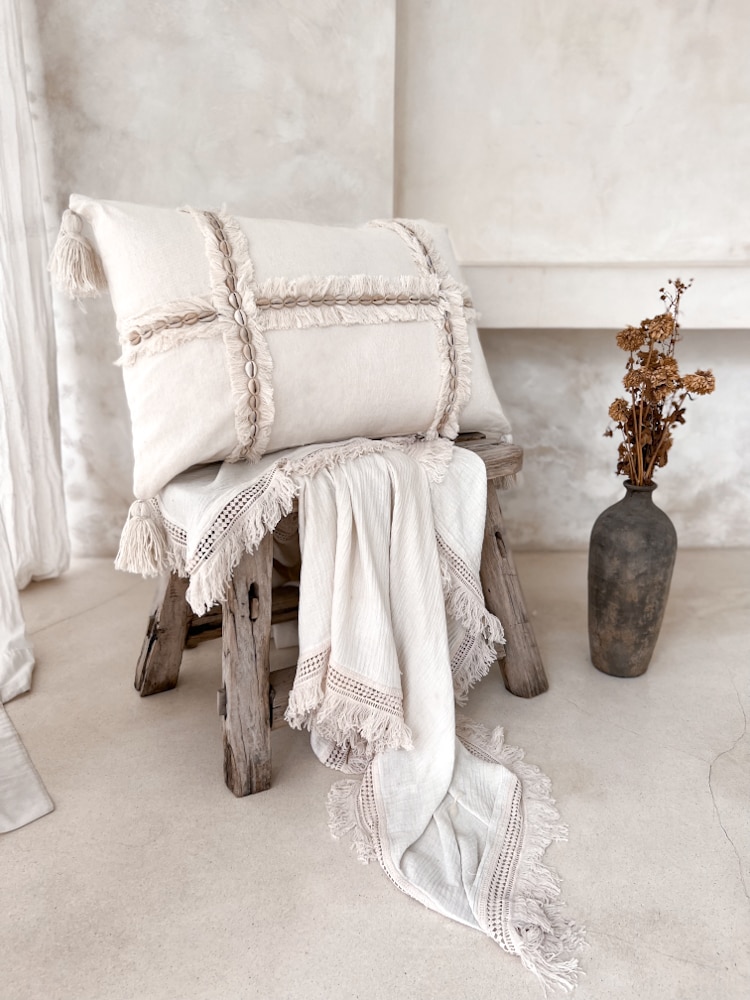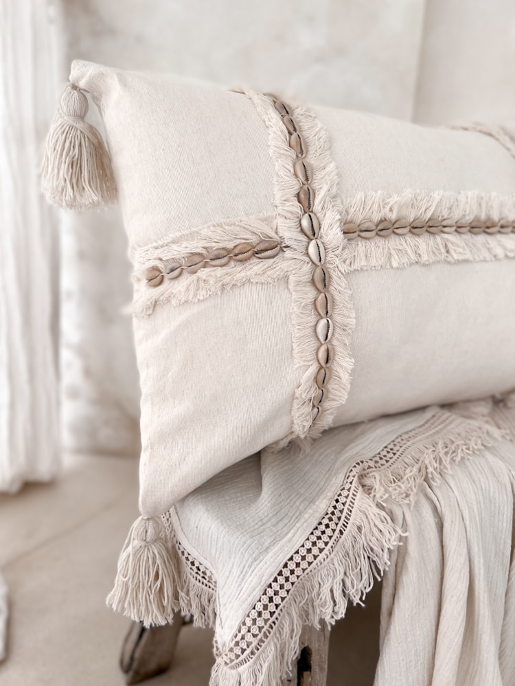 EMI is a rectangular macrame cushion cover that brings a gentle coastal soul to your space. Hand-knotted from natural cotton and finished with flowing fringe and decorative seashells, it’s both relaxed and refined. Ideal for boho interiors or serene beach-inspired homes. Use it on your bed as a soft accent pillow, or pair it with neutral tones on a daybed or armchair. Lovingly made by hand in Bali, this 40×60 pillow is a tribute to the slow beauty of artisanal design.