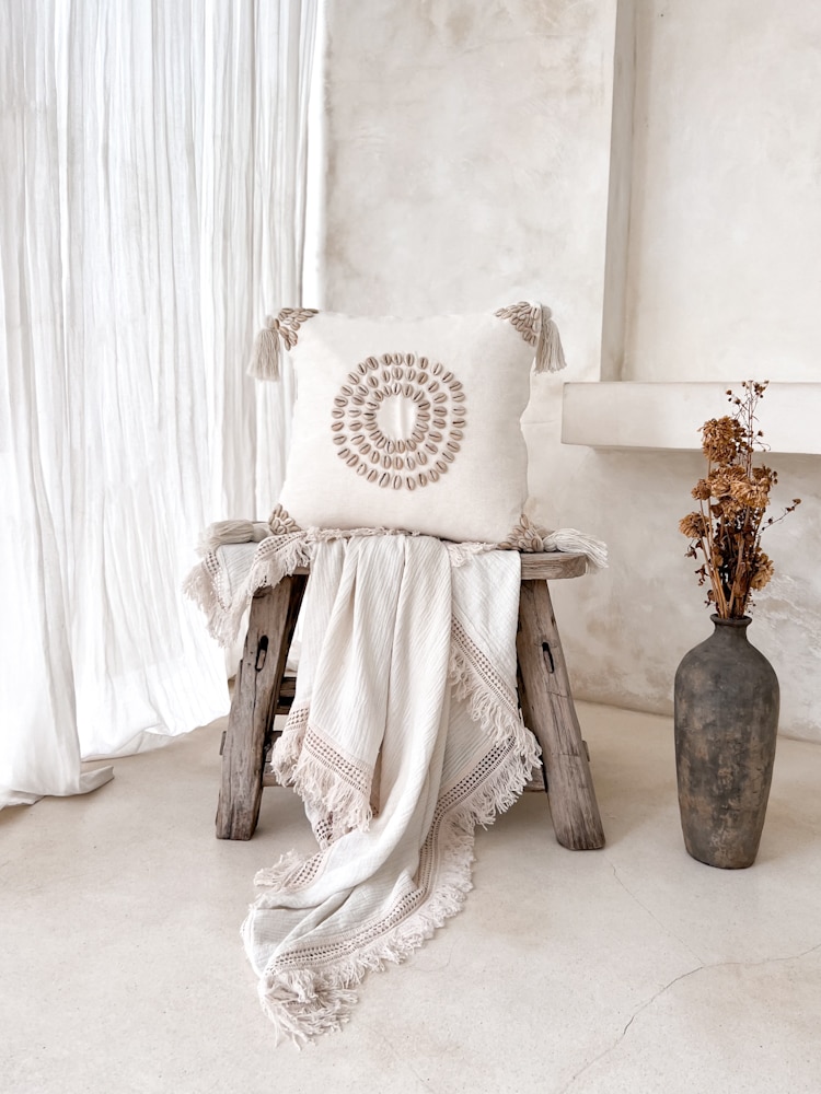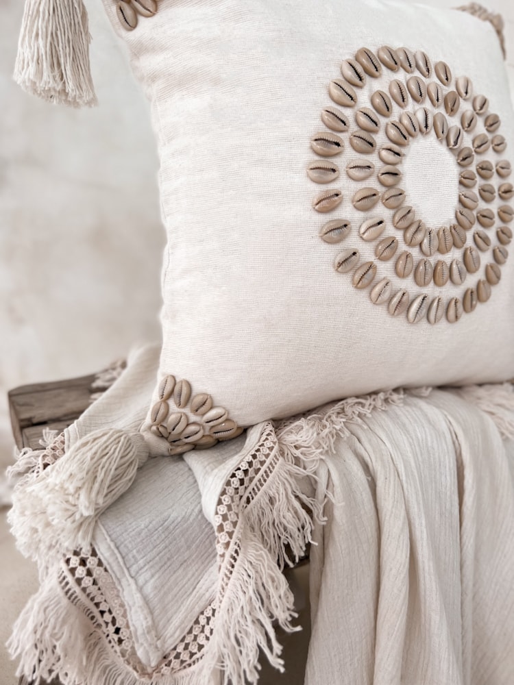 RINA is a handcrafted cushion cover full of natural charm — woven in Bali from cotton yarn, decorated with soft macrame fringes and finished with small decorative shells. This 40×40 pillow adds a coastal, peaceful energy to your home. It fits perfectly into bohemian, rustic, or minimalist interiors where texture and warmth are key. Whether on your sofa, bed, or in a cozy corner, it brings a light island breeze into your living space.