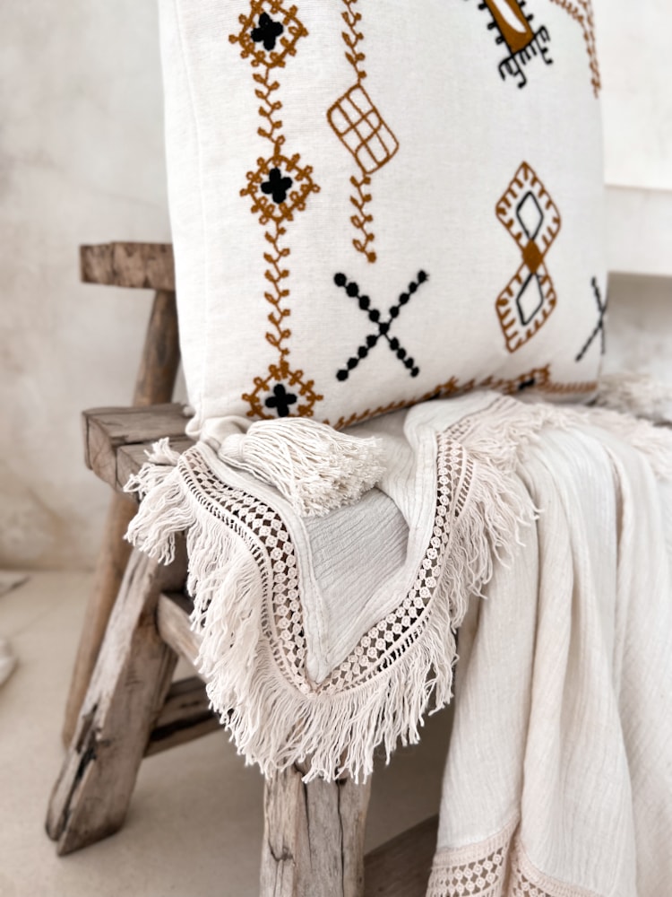 LANI brings balance and boho charm to your decor. This 50×50 cushion cover features soft macrame work and handmade fringe, woven from natural cotton by Balinese artisans. Ideal for neutral, earthy interiors.