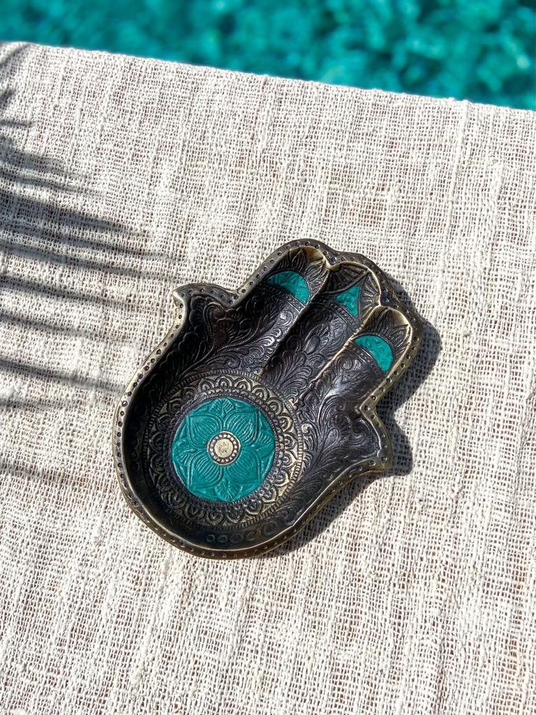 Symbolic and multifunctional, the SISI brass incense holder takes the sacred form of the Hamsa hand — a timeless symbol of protection and balance. Handmade by our artisan friends in Tabanan, Bali, this elegant piece can be used as a decorative incense tray or a resting place for your favorite jewelry.