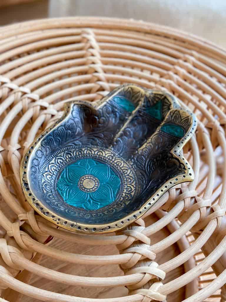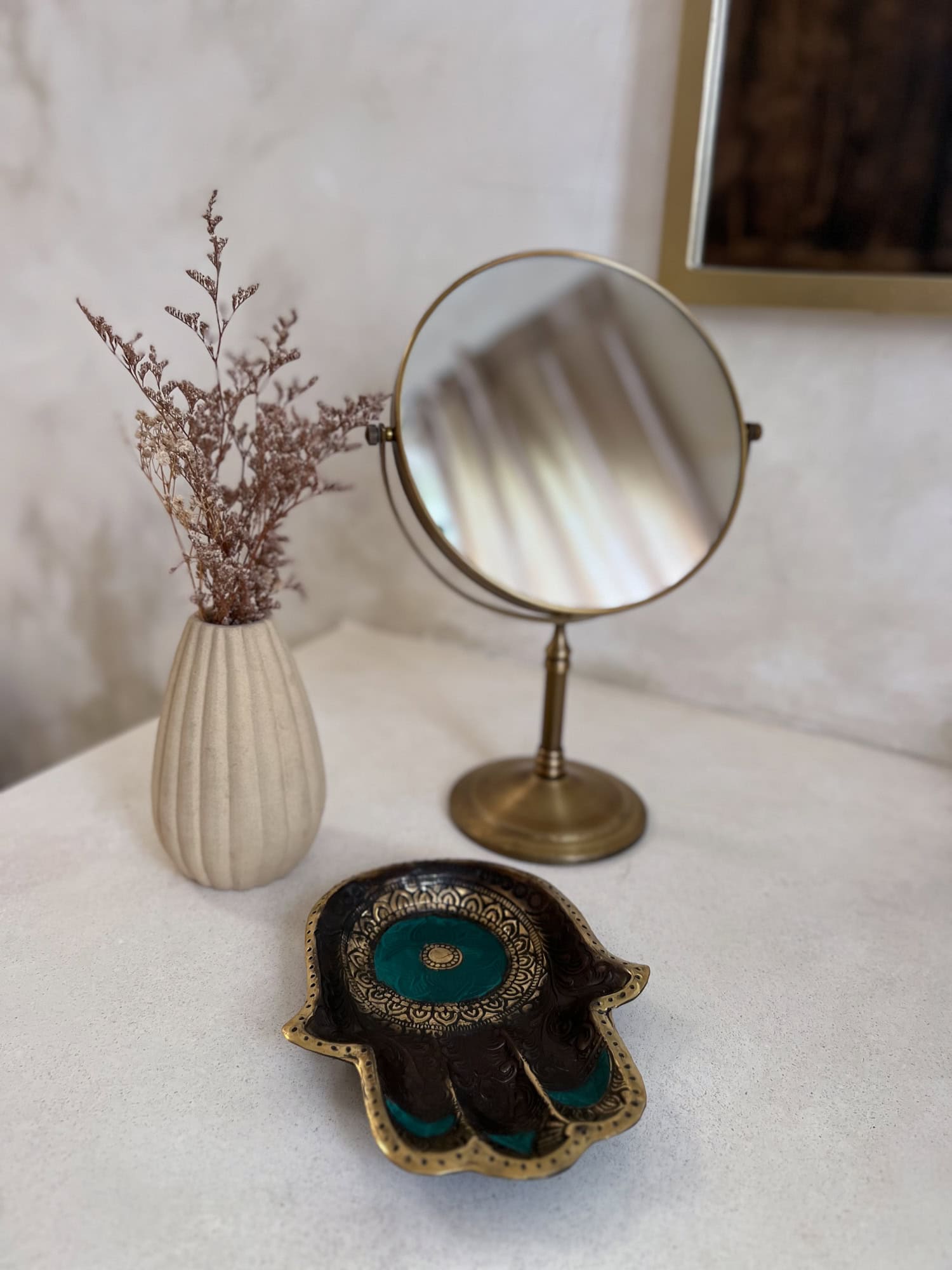 Its handcrafted shape and warm golden tone make it a striking addition to any boho-style interior, from bedrooms to bathrooms or meditation spaces. The Hamsa design not only adds beauty, but also brings a sense of spiritual calm and meaning to your rituals.