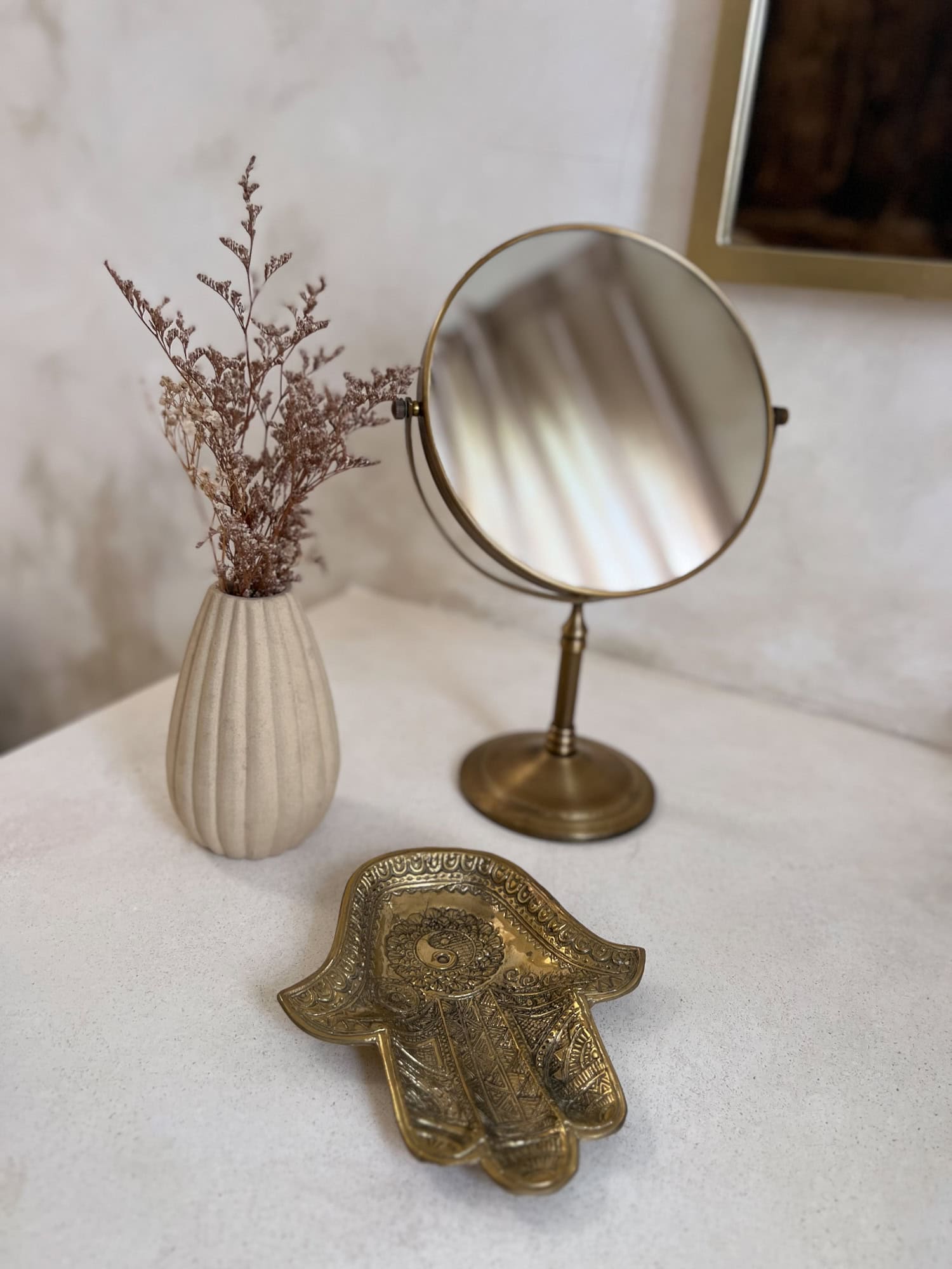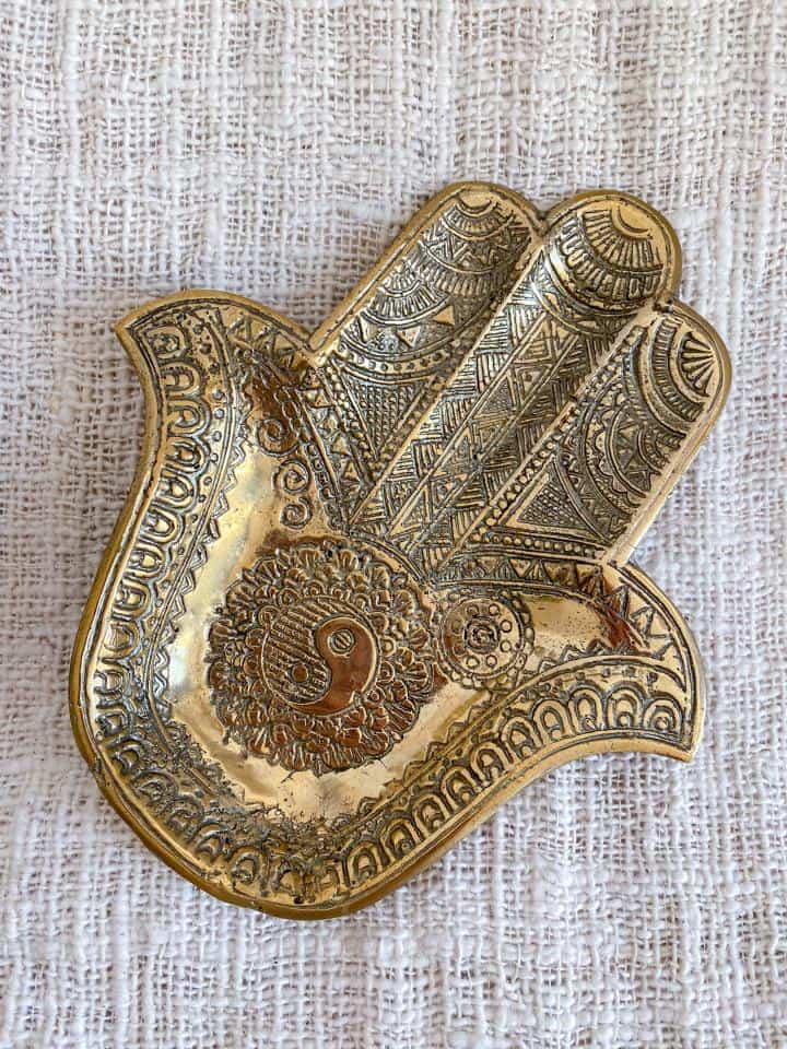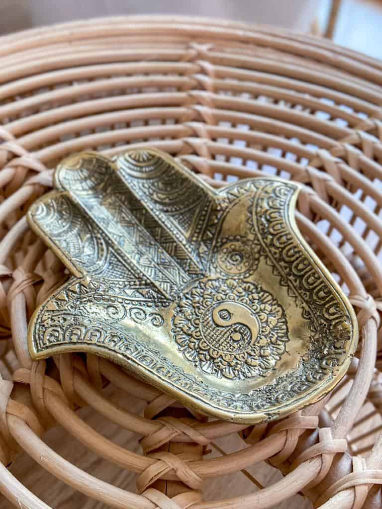 Shaped like the symbolic Hamsa hand, the TANGAN brass incense holder is a beautifully crafted piece that combines function, protection, and artisan charm. Handmade in Tabanan, Bali, from solid brass, it can be used as a boho incense tray or as a decorative jewelry holder to organize your rings and trinkets.