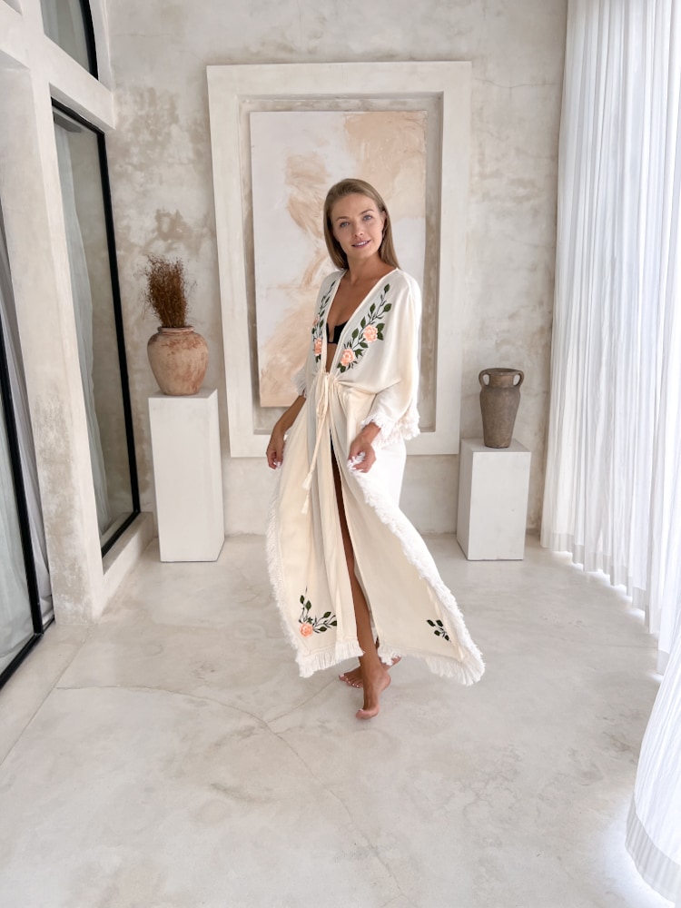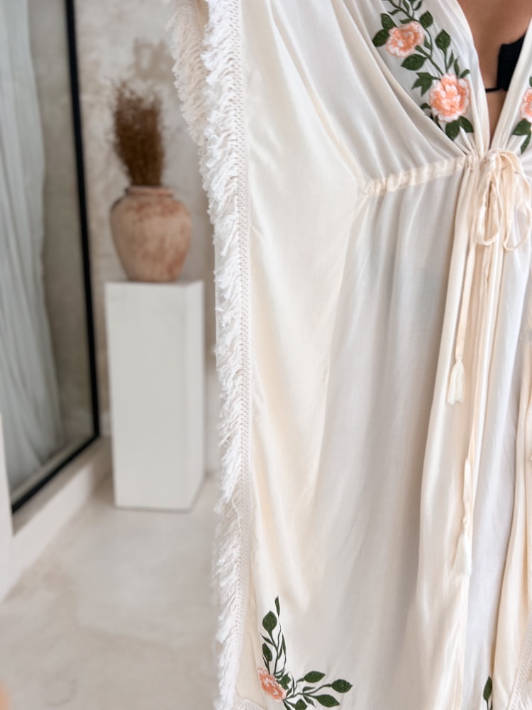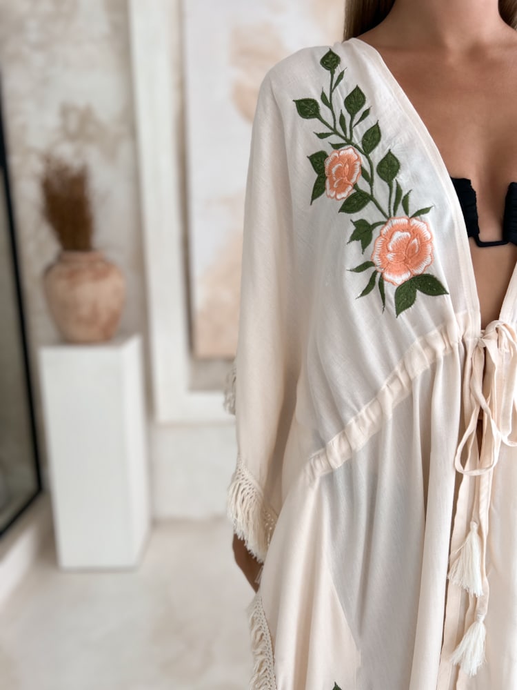 The Boho Maxi Beach Cover-Up MIA Cream is where effortless summer styling meets delicate craftsmanship. Made from breathable rayon and detailed with soft embroidery, this cream beach kimono adds elegance to even the most laid-back moments.