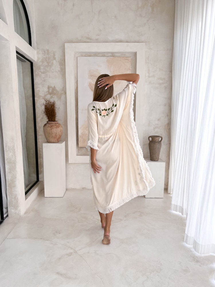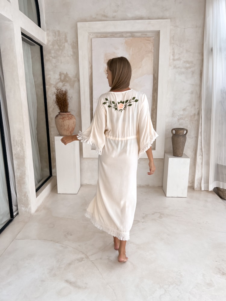 Its lightweight fabric moves gently with the breeze, while the long cut and fringed hem bring a sense of freedom to your silhouette. Whether you’re lounging by the water or winding down at home, this embroidered beach cover-up wraps you in comfort, softness, and quiet style.
