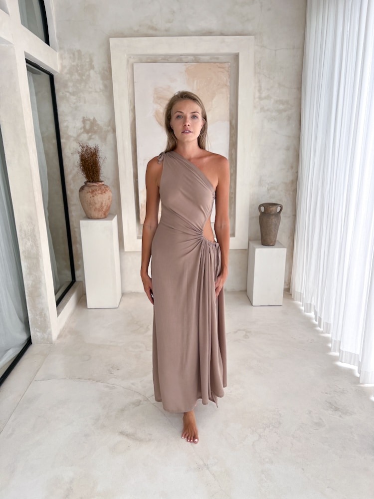 The subtle beige tone adds a touch of minimalism, making it perfect for beach weddings, sunset dinners, or barefoot summer strolls. Featuring a flattering circular cut-out at the waist and a matching fabric tie, you can easily adjust the fit and draping to suit your body. Whether styled up with jewelry or worn barefoot on holiday, this boho summer dress is a versatile wardrobe staple handmade with love in Bali.