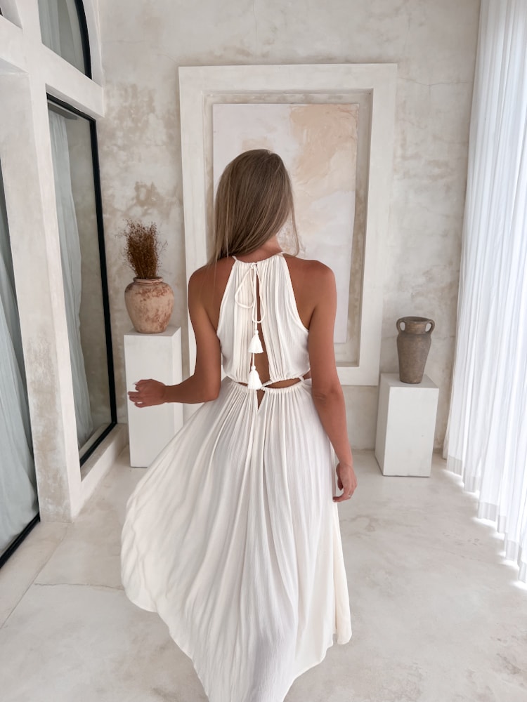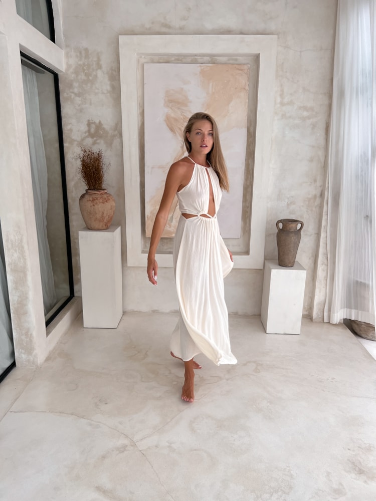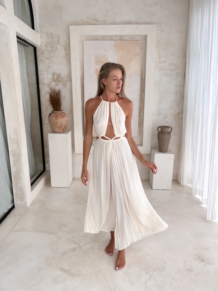 Elegant yet effortlessly relaxed — the ivory boho dress SENTI is your go-to piece for both elevated occasions and laid-back summer evenings. Handcrafted in Bali from lightweight, breathable rayon, this bohemian maxi dress feels like a breeze against your skin, making it perfect for hot, sunny days.