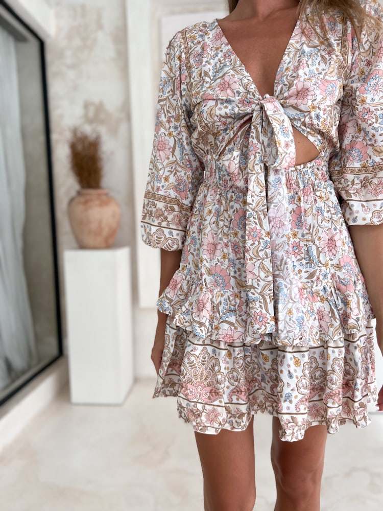 Its flattering cut gently hugs the waist with an elastic band and adjustable tie at the bust, offering both comfort and flexibility. The warm beige tone complements every skin tone and enhances that sun-kissed glow. Whether paired with sandals, a woven bag, or natural jewelry, this boho short dress will make you feel confident and carefree all season long.