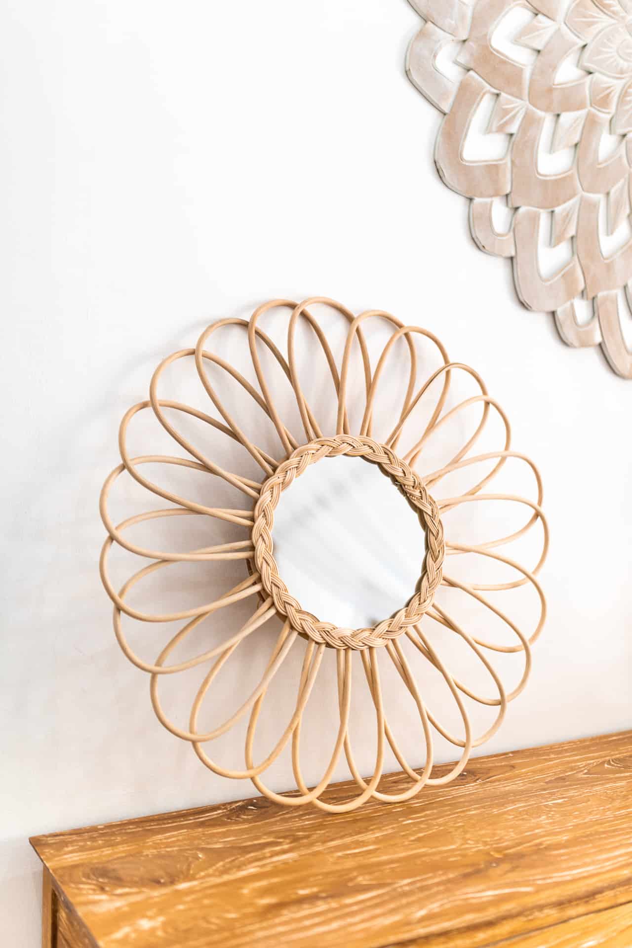 This charming flower-shaped boho mirror was carefully handcrafted in Bali using natural rattan. Its delicate petals are made from steam-softened rattan branches, allowing the artisan to bend and form them into this unique floral silhouette. The result? A rattan wall mirror that brings both warmth and texture to your space.