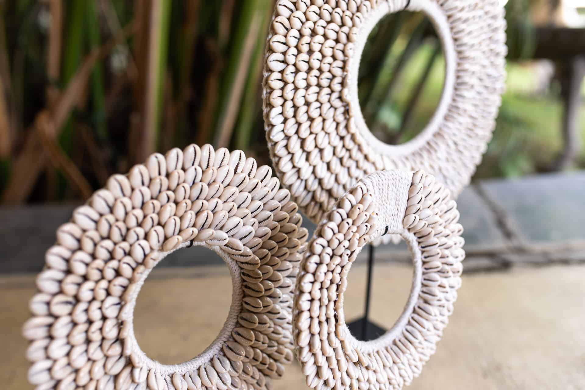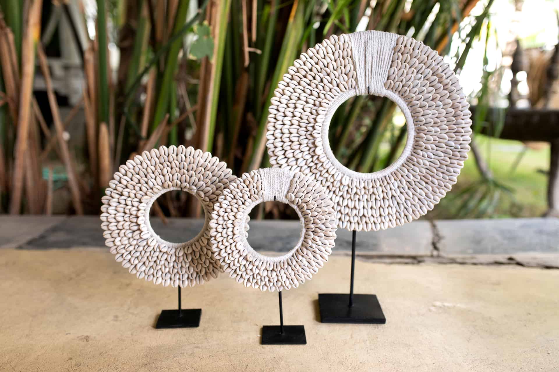 This beautiful boho shell decoration brings an effortless island vibe to any interior. Handcrafted in Bali from dozens of natural kauri shells, it’s a unique and symbolic piece that echoes the rhythm of the ocean. The round shape and delicate detailing make it a standout coastal-style sculpture for your home.