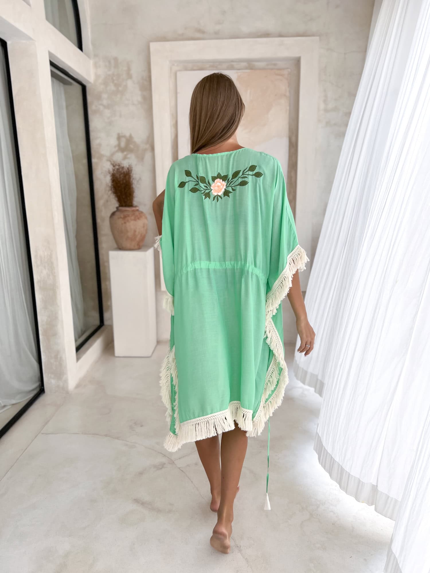 The Boho Short Beach Cover-Up MIA Mint brings a refreshing breeze to your summer look. Made from lightweight, breathable rayon, this mint boho kimono features soft fringes and a relaxed cut that makes it the perfect choice for sunny days by the sea or pool.