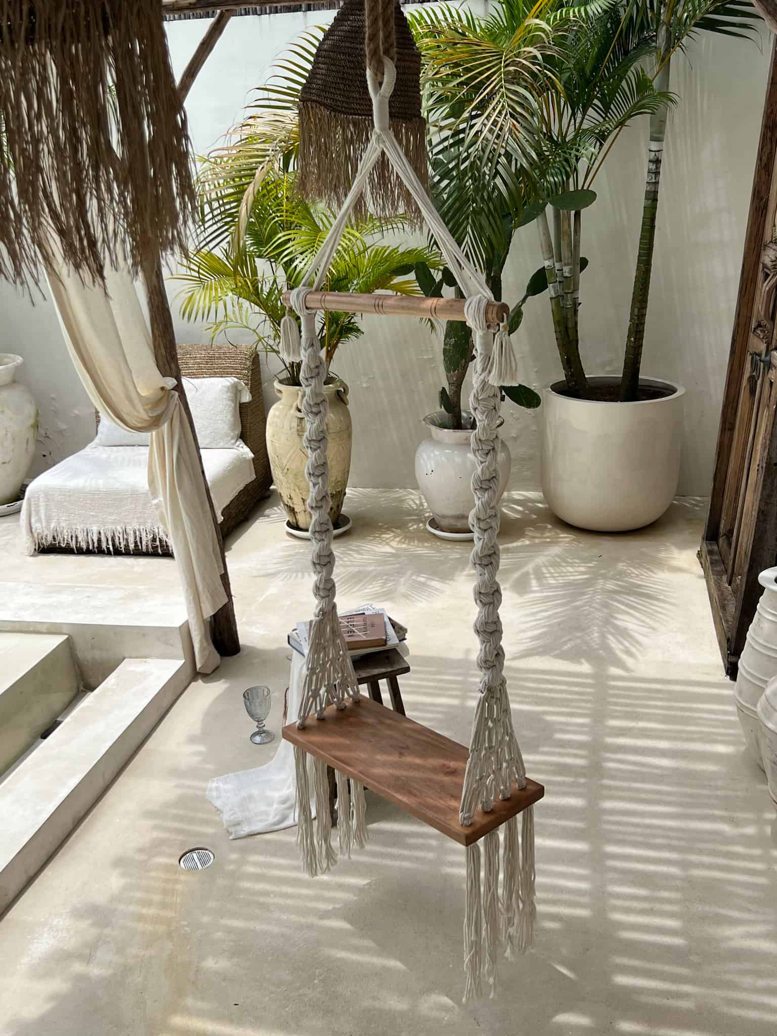 Handcrafted hanging swing with a solid wooden seat. Every strand of cotton has been woven with care and passion by skilled Balinese artisans, ensuring exceptional quality and attention to detail. This boho-style swing chair is perfect for use as a garden swing, balcony seat, or an eye-catching hanging accent in your bedroom or living room. Its natural materials and relaxed form make it ideal for creating cozy corners, reading nooks, or meditation spots.
