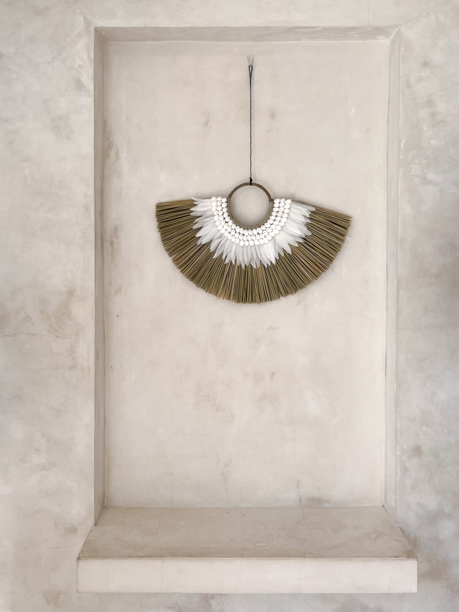 Boho Wall Decoration – SUKU with Feathers is a unique decoration that brings lightness and an ethereal charm to your interior. Beautifully crafted feathers arranged in a unique pattern make this a perfect choice for those who appreciate boho home accents and want to add a touch of nature to their spaces.