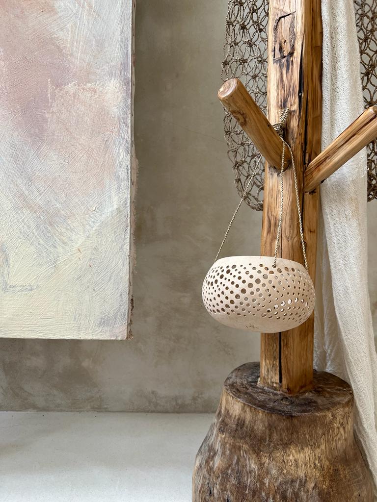 Let the soft glow of island evenings into your home with our DOTS coconut lantern. Handmade from real coconut shell and carefully carved with dotted patterns, this boho candle holder creates a magical play of light and shadow on your walls.