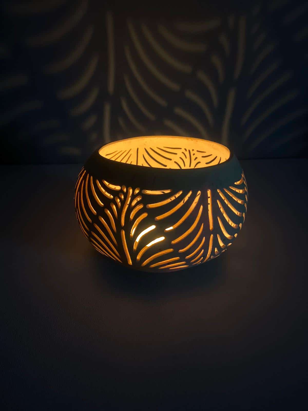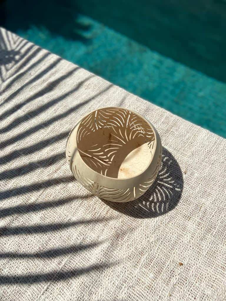 Bring the essence of the tropics into your home with the LEAF coconut lantern — a handmade candle holder carved from a real coconut shell with a graceful leaf design. When lit, it casts soft shadows that evoke the feeling of sitting under palm trees at sunset.