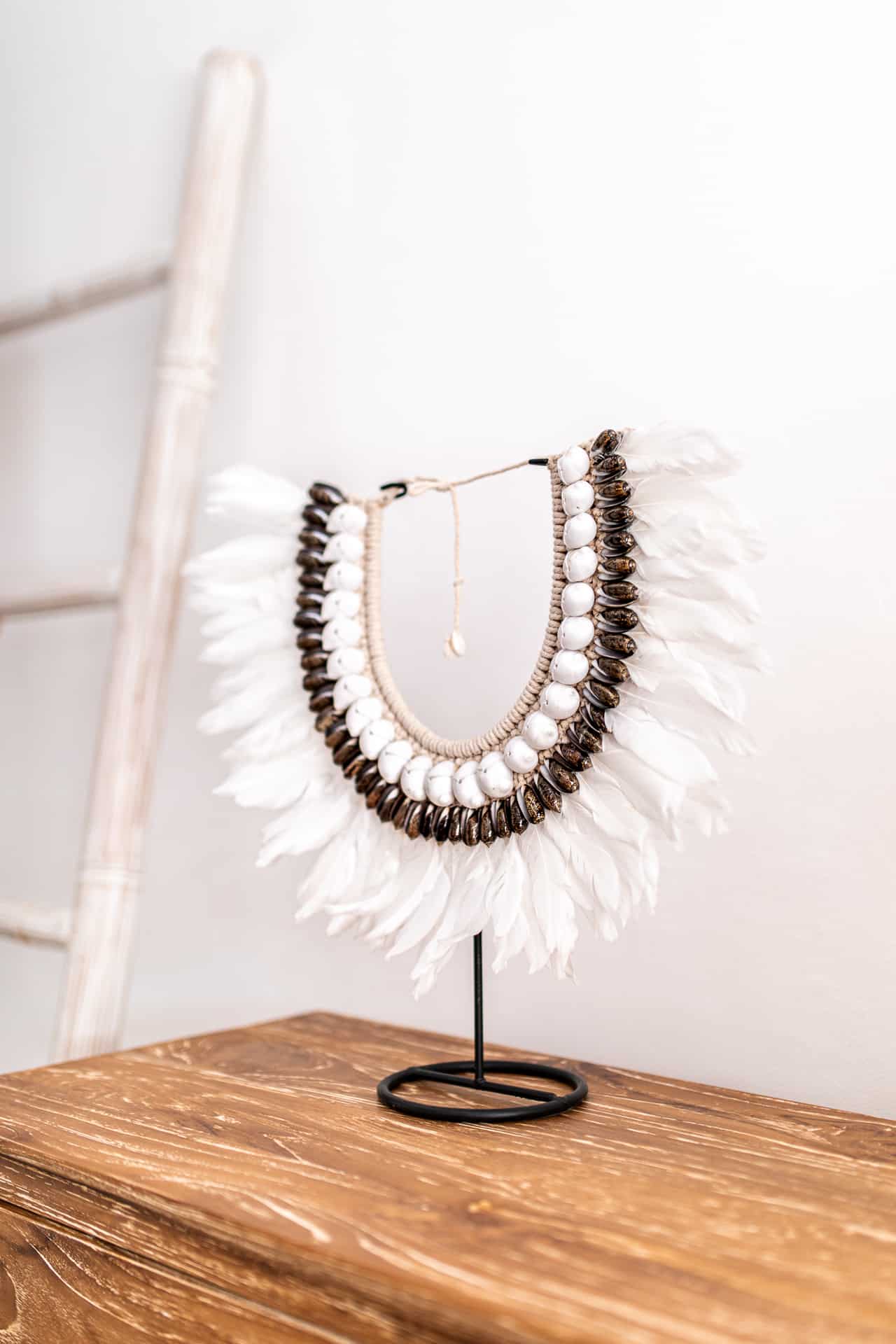 This elegant feather and shell decoration in white brings soft texture and island charm to your interior. Handmade in Bali by skilled local artisans, it features delicate kauri shells and light feathers arranged in a symmetrical, tribal-inspired pattern. Mounted on a sleek metal stand, it’s perfect for adding a serene, boho-chic vibe to your living room, hallway, or bedroom.