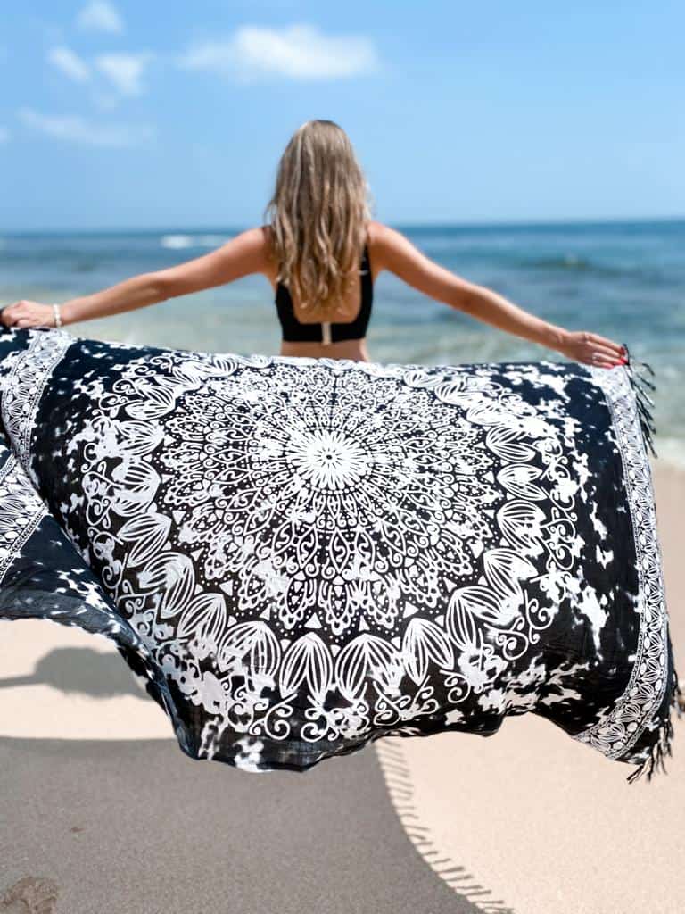 Wear it your way: as a flowy pareo wrap tied behind the neck for a touch of an oriental dress, around your hips as a classic beach sarong, or simply draped over your shoulders. It also makes a great beach mat when you want to relax on the sand. Thanks to its compact size, it slips easily into any beach bag. The intricate patterns are inspired by mandalas – mystical symbols rooted in Buddhist tradition.