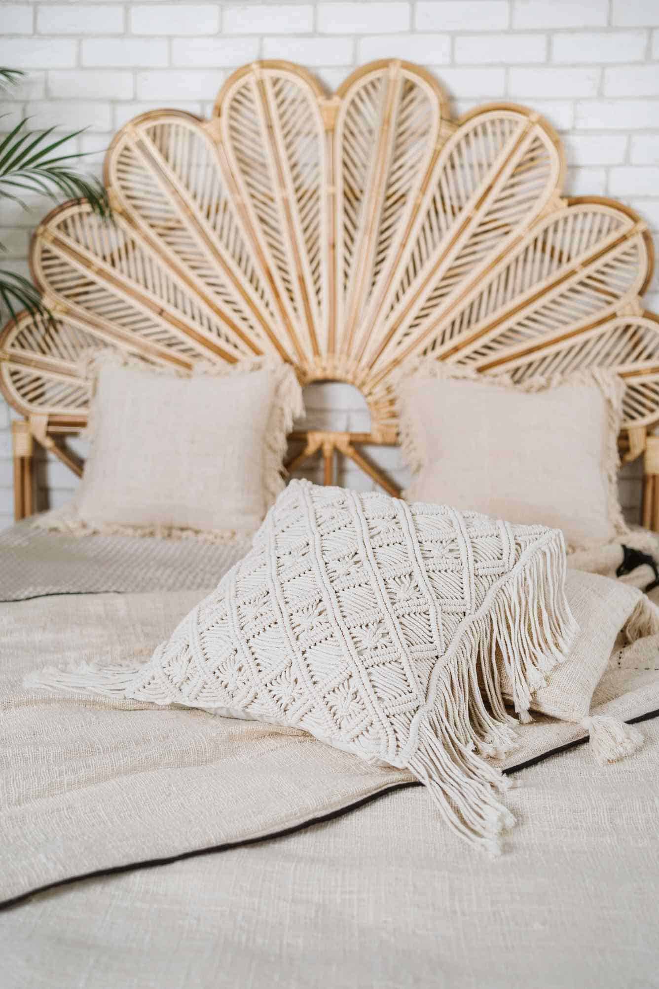 DUA L combines natural texture with handmade charm. Crafted from cotton and finished with soft macrame fringes, it’s perfect for layering on your couch or bed. The 50×50 size makes it a cozy, eye-catching addition to boho-inspired interiors.