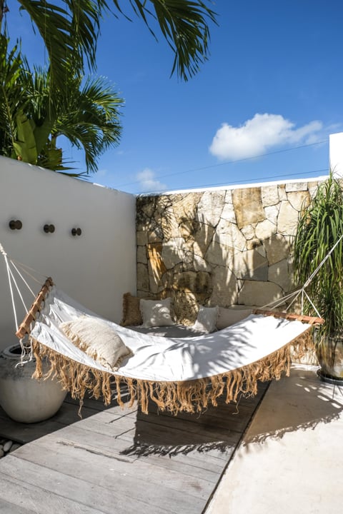 A boho-style hammock with fringes that brings warmth and texture to any space. Perfect for the balcony, garden, or a cozy reading corner indoors. This hammock is handwoven by Balinese artisans using a unique blend of cotton and jute, giving it a raw yet refined look that fits beautifully into natural, bohemian interiors.