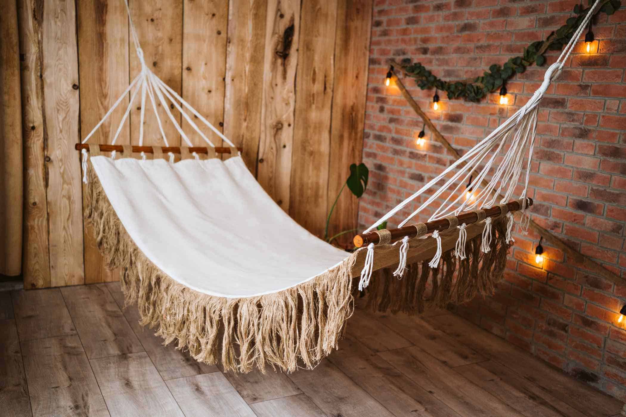 Style it with a macrame pillow or a raw cotton throw for a relaxed island vibe. The natural materials and earthy tones of this BOHO hammock are perfect for anyone looking to add a touch of rustic elegance while keeping the atmosphere warm and inviting.