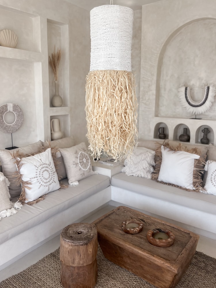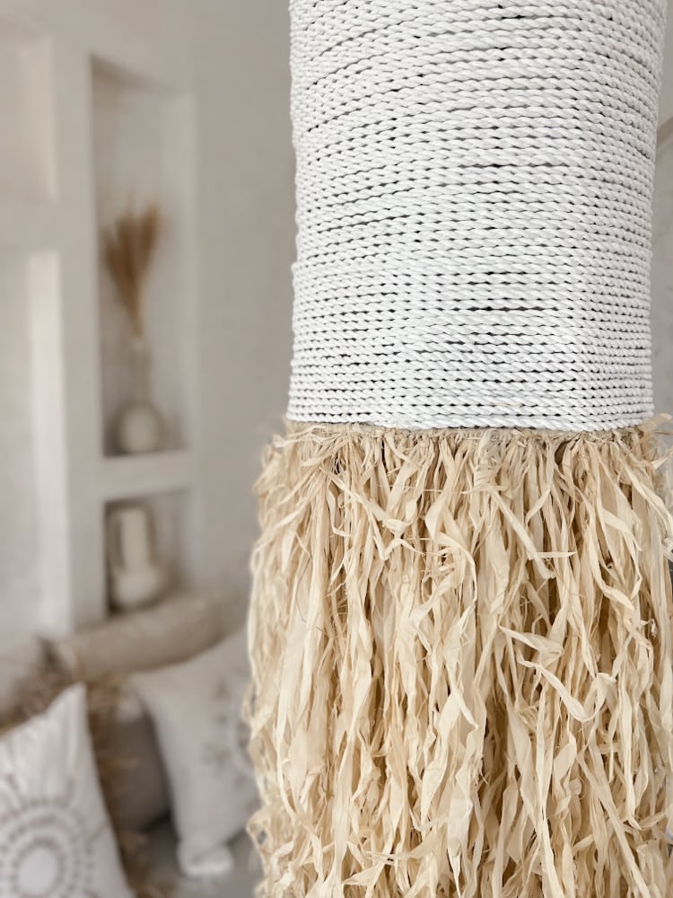 The Long Raffia Fringe Pendant Light GITA is a striking hanging lamp designed to add height, texture, and artistic flow to your space. With cascading fringes and a tall silhouette, it’s a true rattan lighting sculpture.