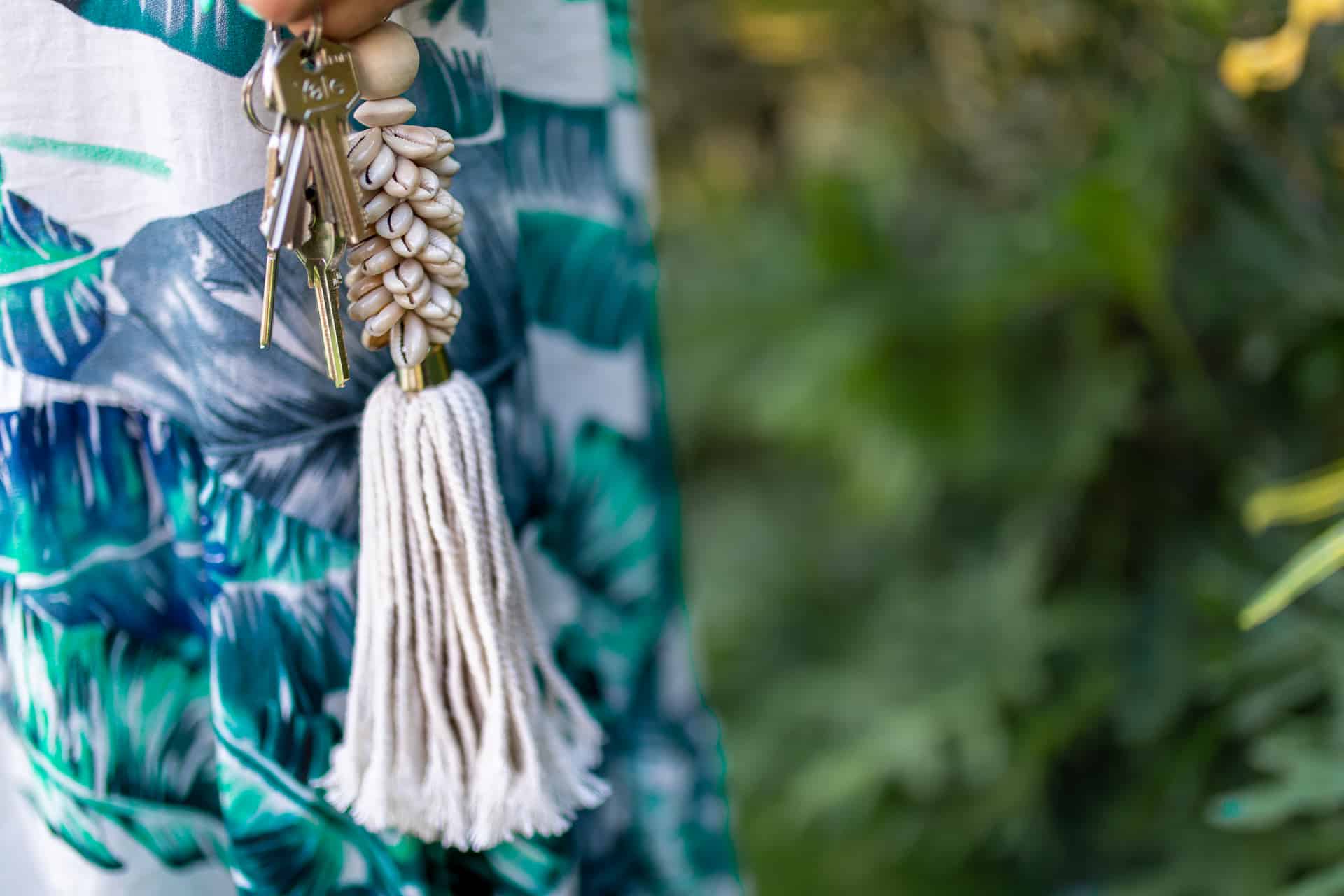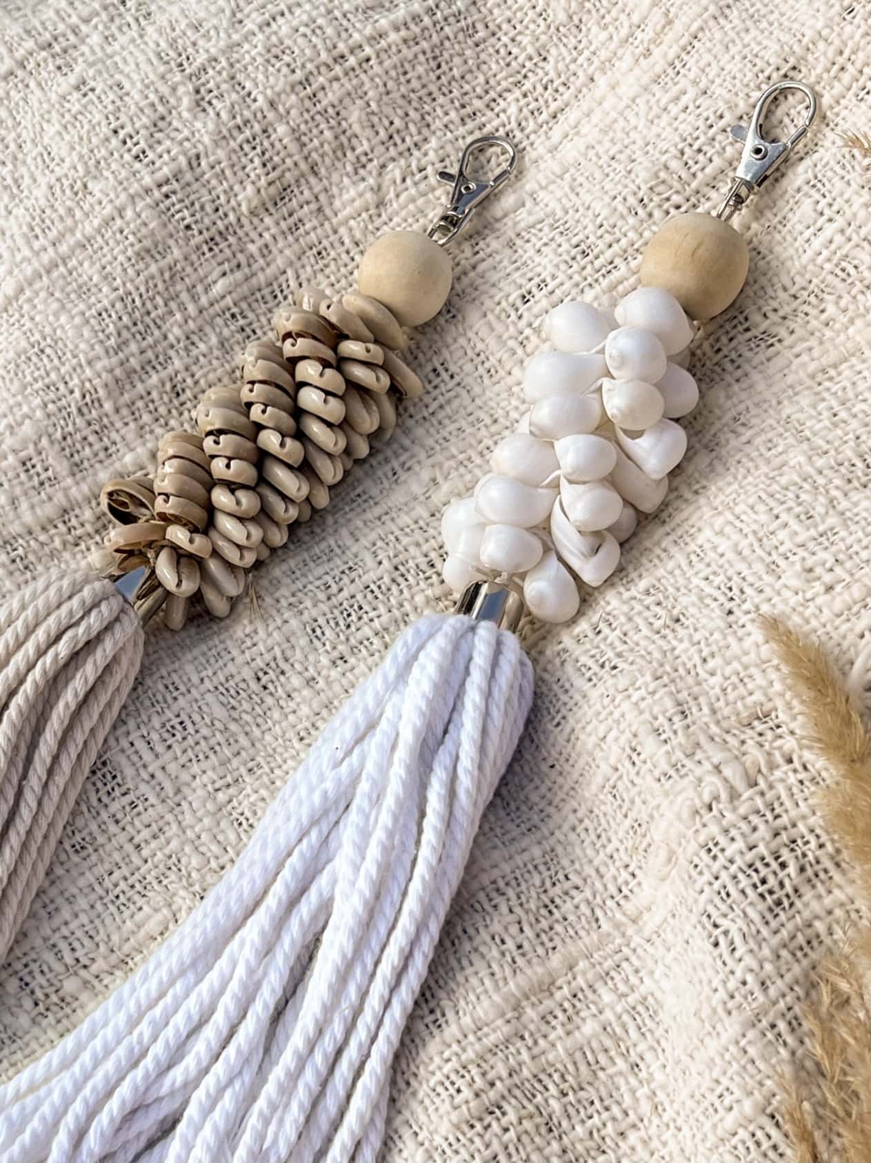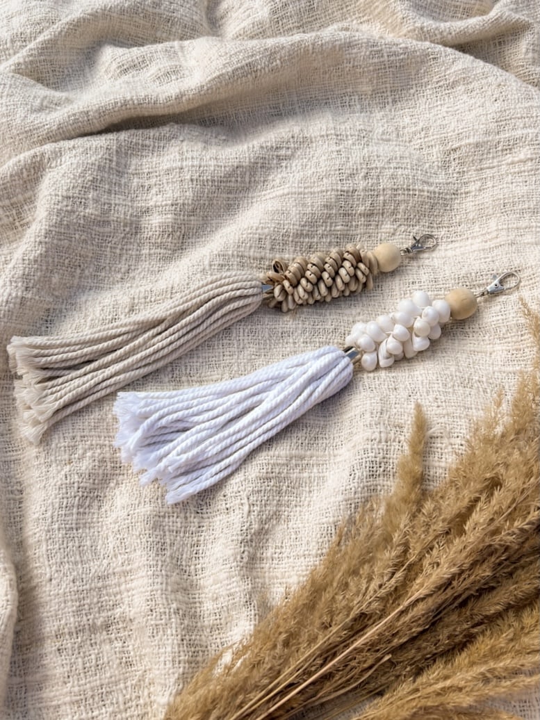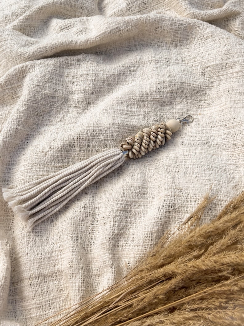 Add a touch of tropical magic to your everyday accessories with this handmade dark macrame charm, crafted from soft cotton and natural kauri shells. Whether clipped to your bag, hung from your rearview mirror, or used as a keychain, this boho tassel accent brings laid-back island vibes wherever you go.