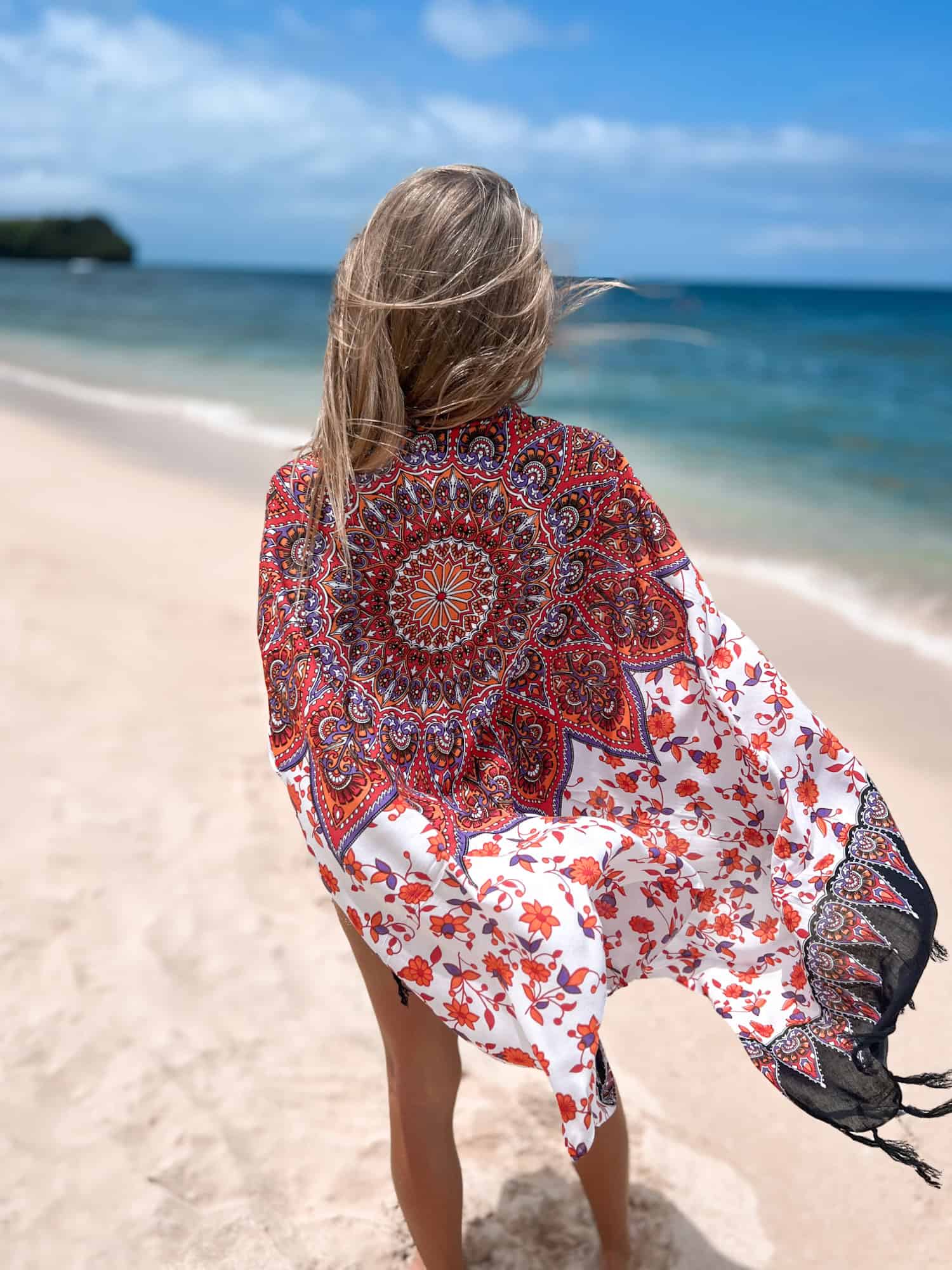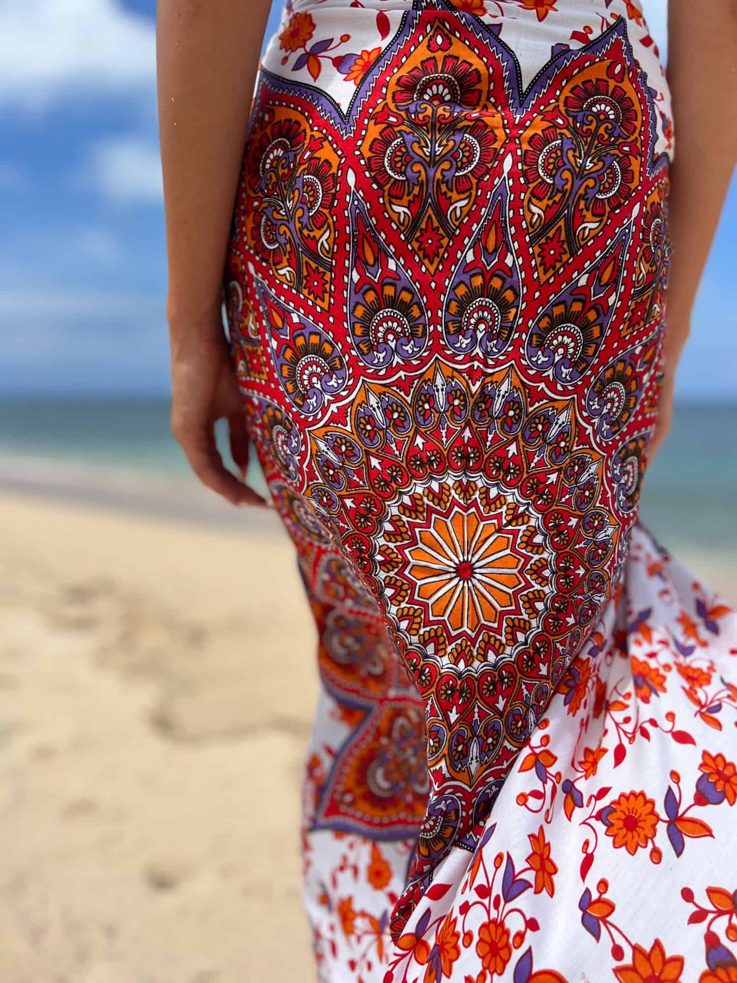 Description: Orange-white beach wrap with mandala print – light and versatile for summer