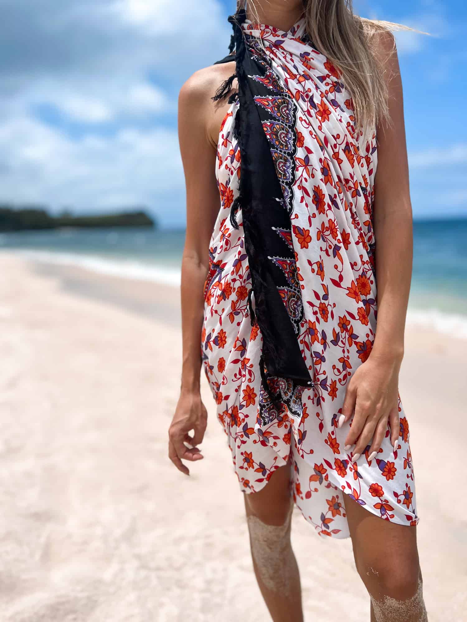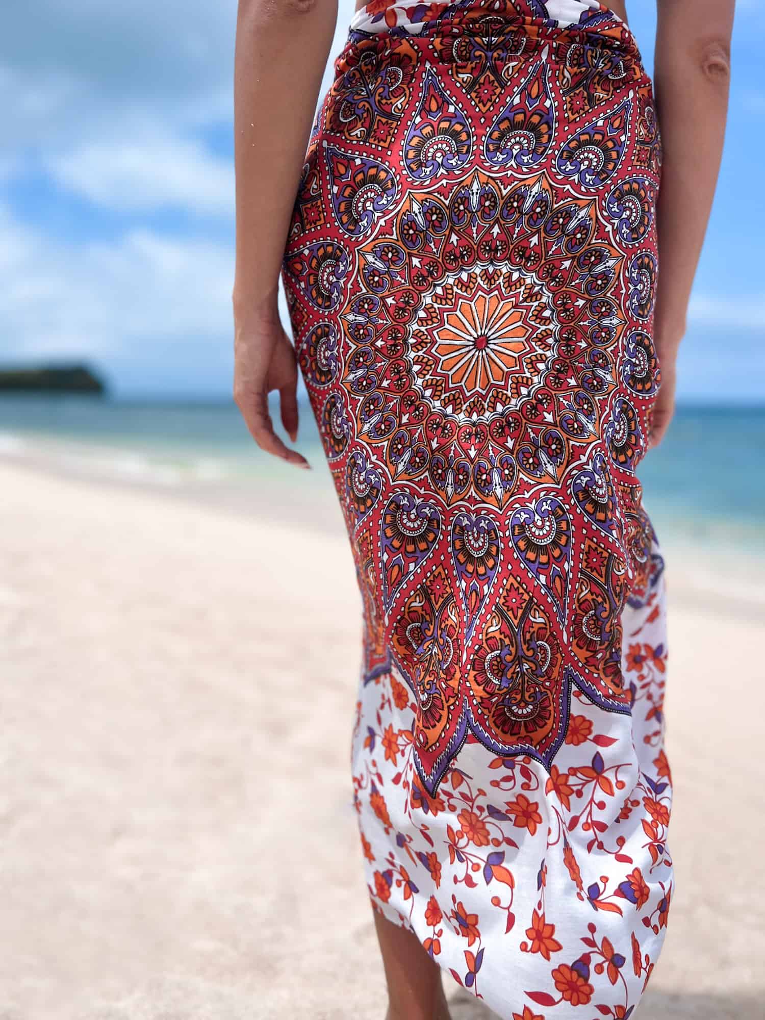 The MANDALA ORANGE-WHITE tropical pareo wrap is your invitation to summer brightness. With its vibrant two-tone color palette and hypnotic mandala design, this lightweight beach sarong adds warmth and personality to any seaside look.