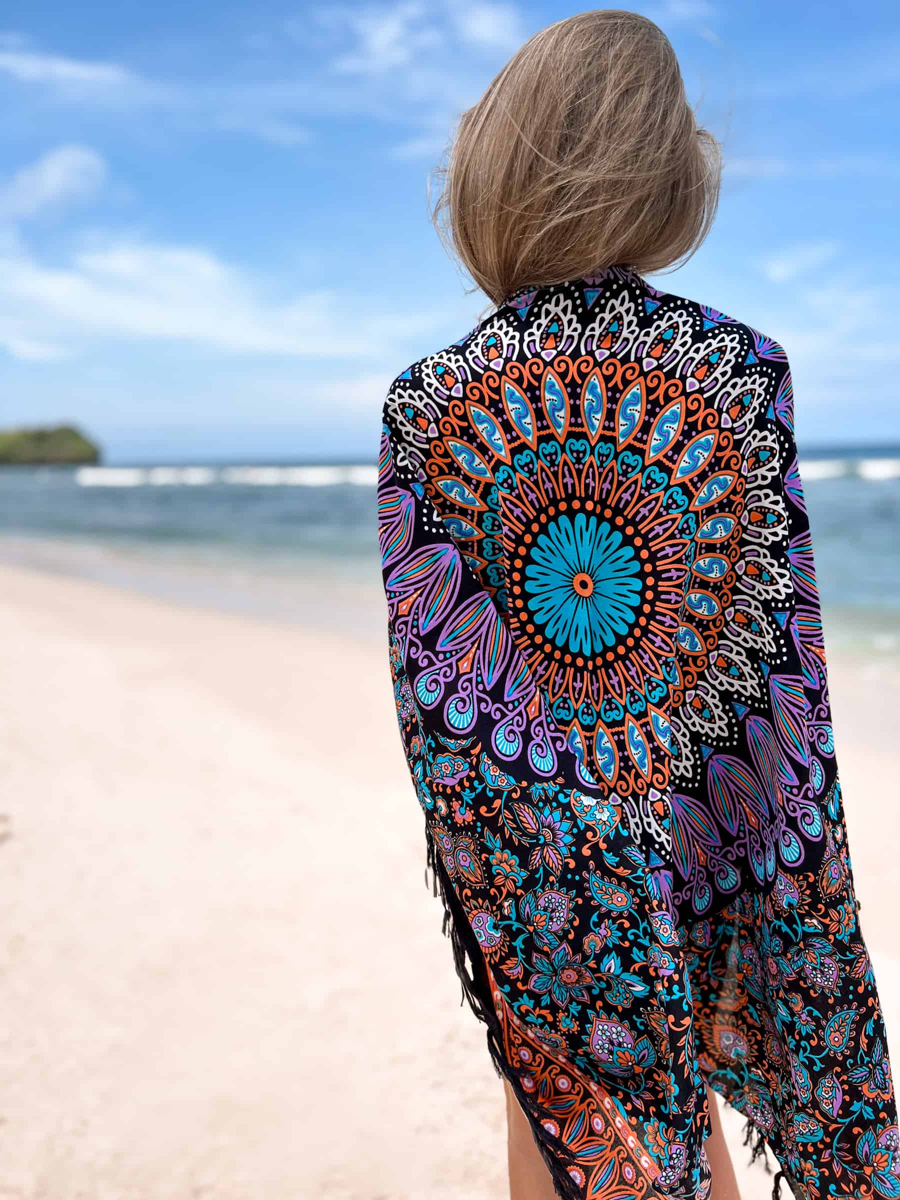 The deep purple tone and mandala-inspired design bring a bold, artistic energy to this versatile pareo. Drape it as a beach tunic, knot it around your waist as a sarong skirt, or wear it as a light shawl for evening breezes—it adapts to your plans with grace and flow.