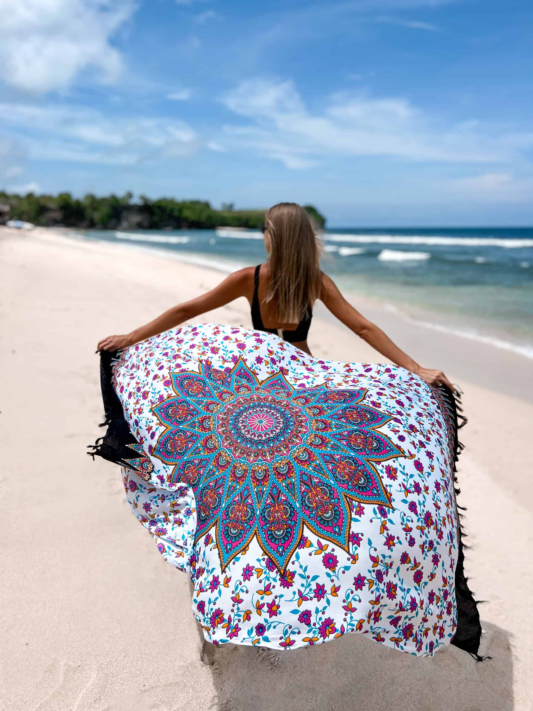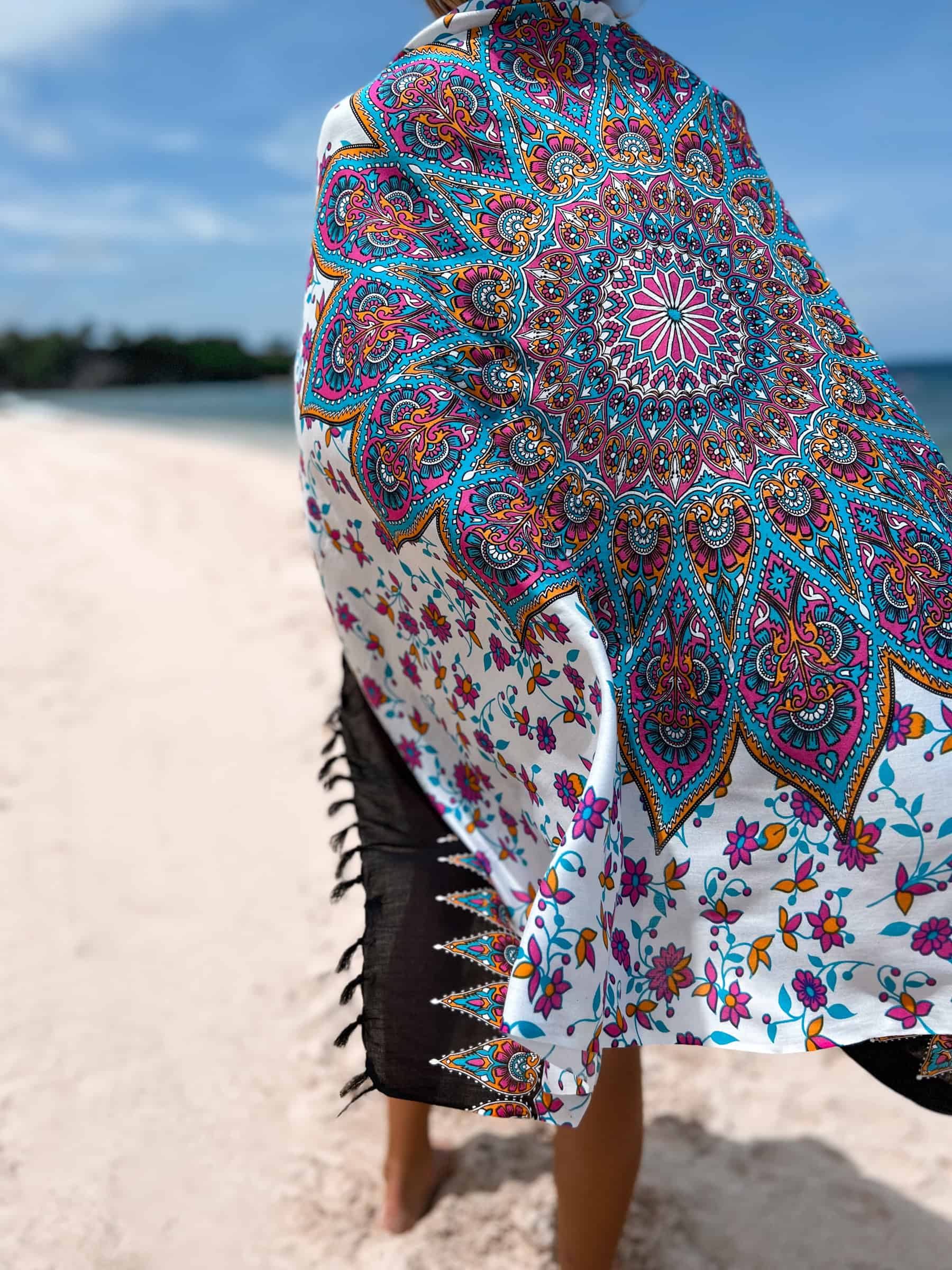 Description: Two-tone beach wrap with mandala print – versatile and breathable