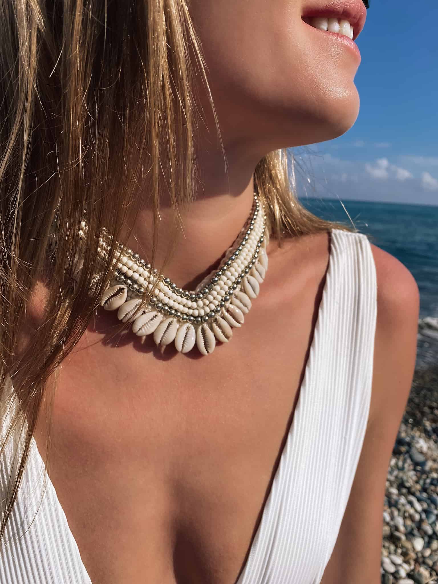 Its soft tones and lightweight design make it perfect for layering or wearing solo as a statement of effortless elegance. This handmade beach necklace is for those who appreciate organic materials and timeless bohemian jewelry.