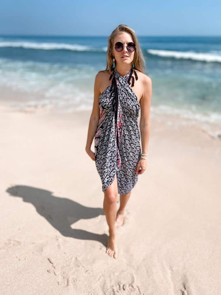 The mandala-inspired patterns are drawn from sacred Buddhist art found across Bali – a subtle nod to the island’s cultural spirit. Whether you’re lounging by the pool, walking the shoreline, or enjoying a sunset cocktail, this boho sarong adds a soft, feminine touch to your look.