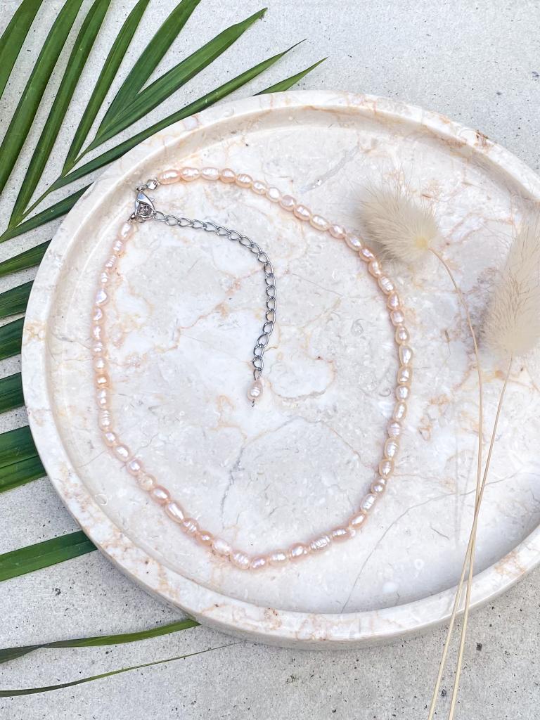 The necklace comes with an adjustable clasp, allowing you to wear it as a snug pink pearl choker or a relaxed, boho-style necklace. These softly shimmering pearls catch the light in a way that makes every outfit feel a little more special — from beach weddings to everyday wear.