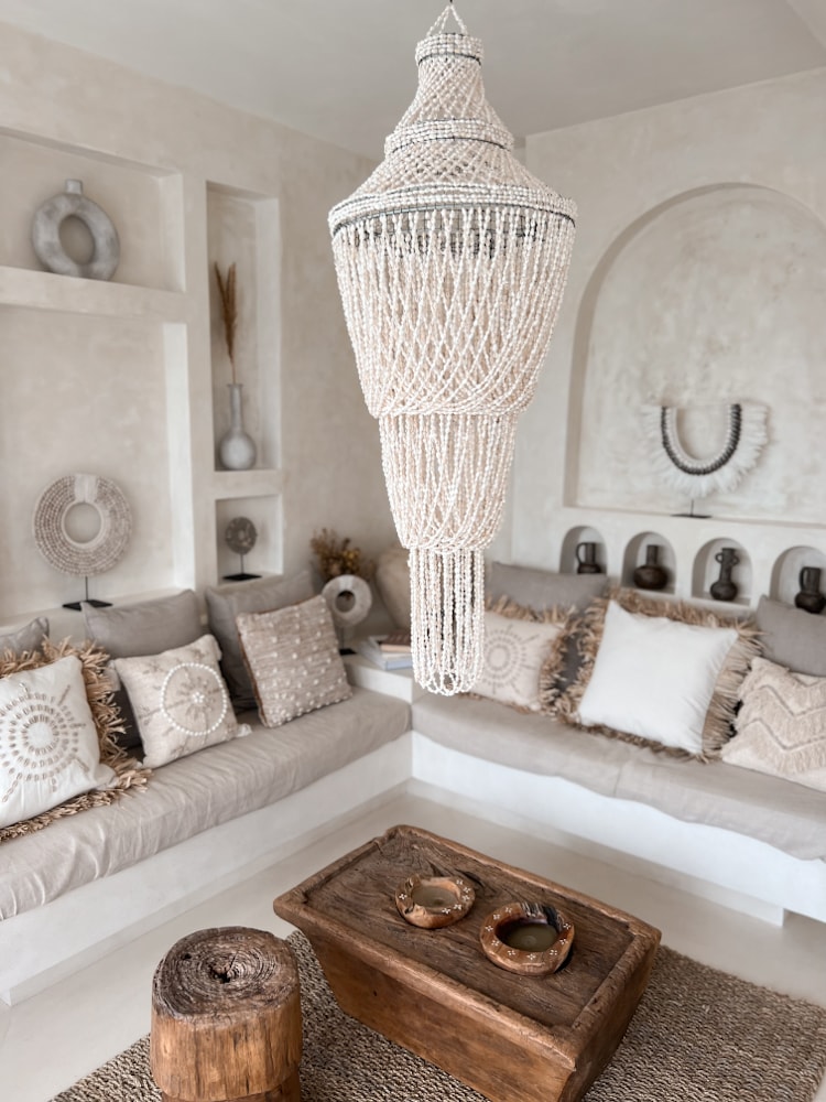 The Shell Chandelier MILA is an elongated boho lighting piece that evokes the rhythm of the sea. Crafted with layers of natural shells, it adds movement, shine, and texture to coastal-inspired interiors.