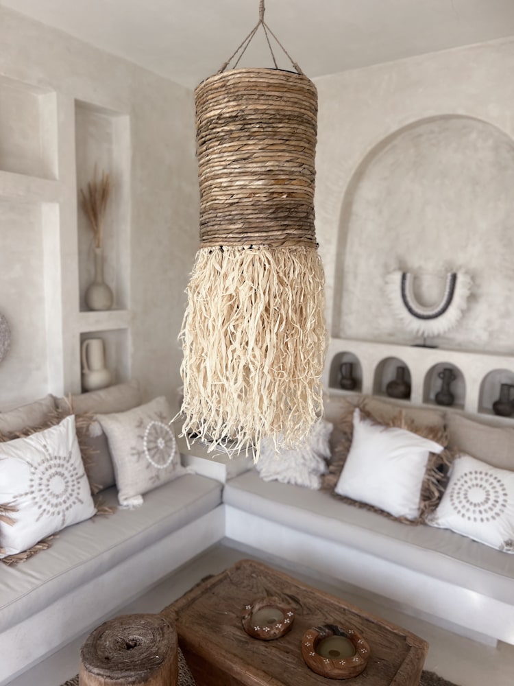 The Long Raffia Fringe Pendant Light JAYA is a sculptural pendant that captures the soul of bohemian interiors. Handwoven from natural raffia and finished with flowing fringes, it brings height, texture, and rhythm into your design.