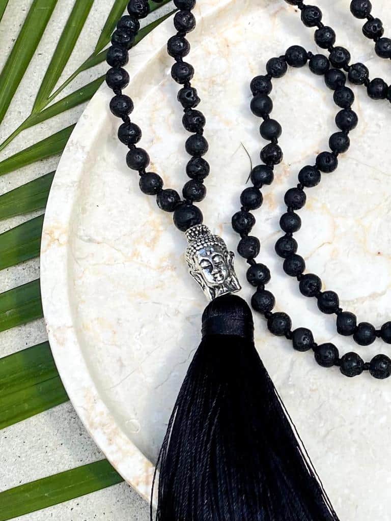 Opis: Naszyjnik z lawy wulkanicznej czarny z motywem głowy buddy