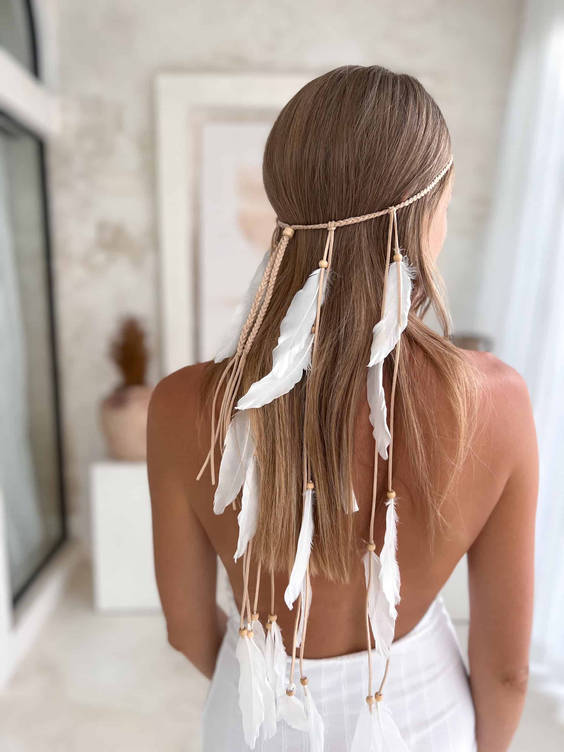 Designed to move with you and catch the light as you dance or wander, it’s more than just a hairband—it’s wearable poetry. Each strap can be repositioned along the band, letting you shape the look to suit your mood. Wear it as a crown, braid it into your hair, or let the feathers sway freely with every step.