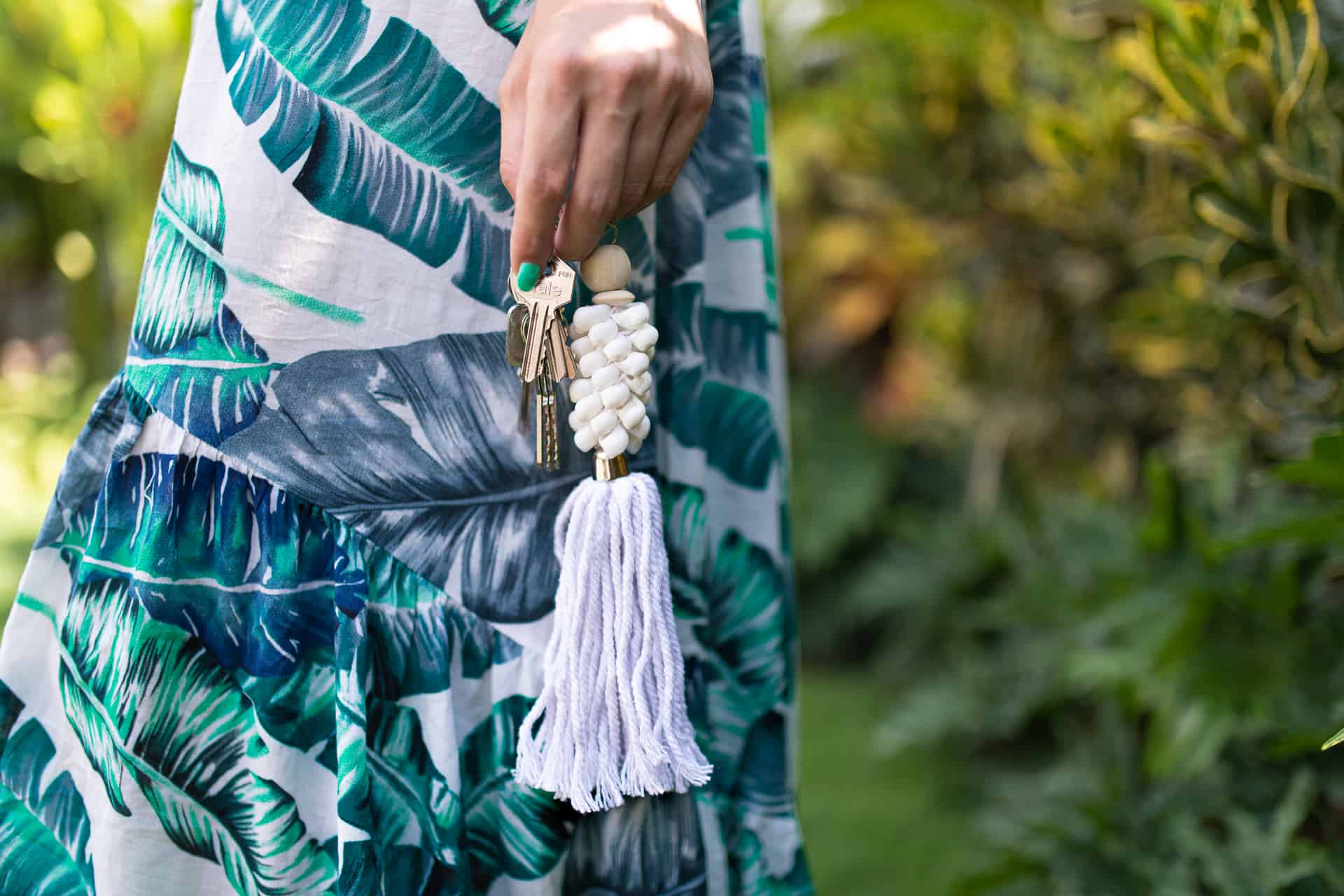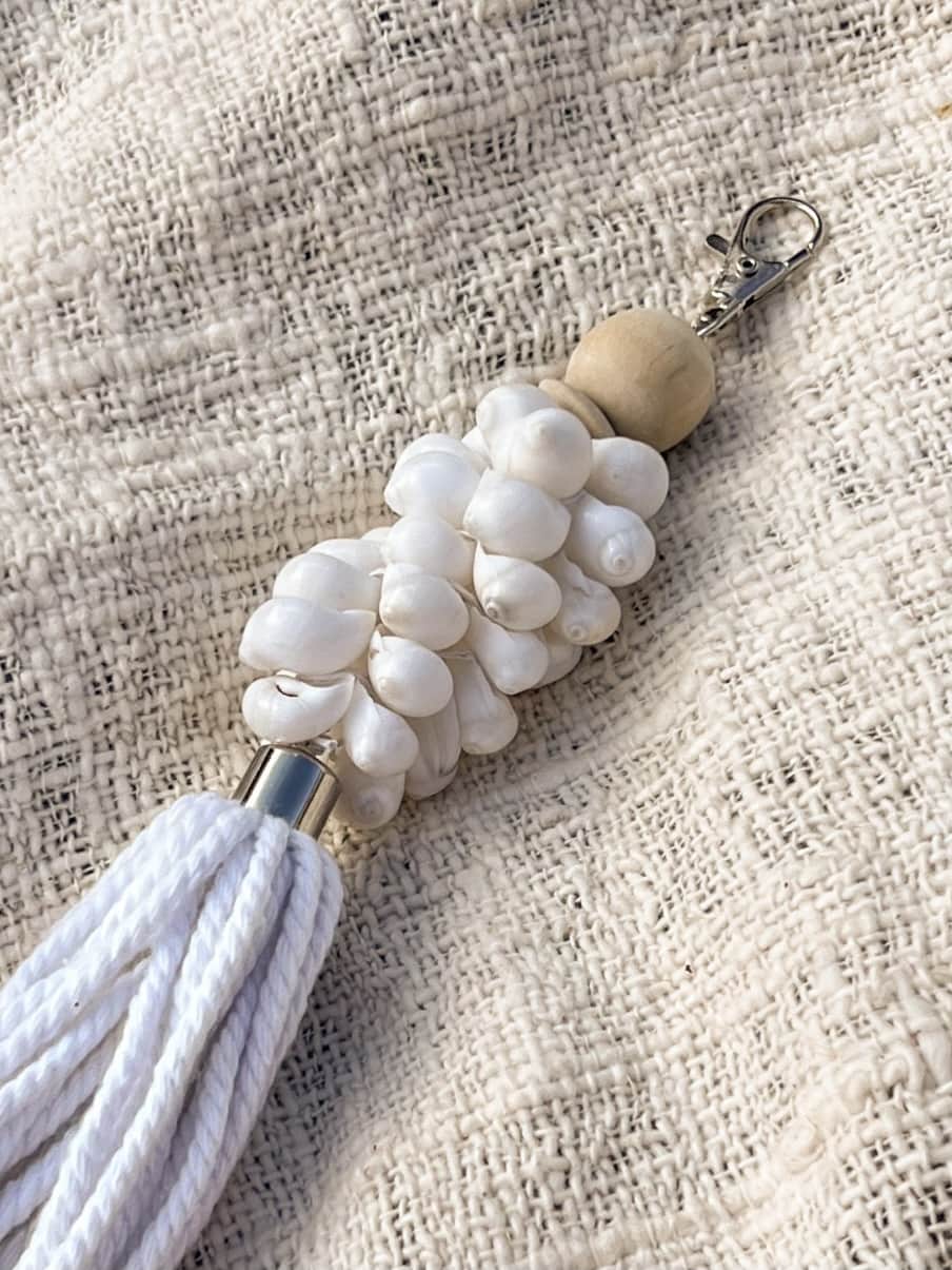 Let your keys, tote, or favorite beach bag carry a little piece of Bali with this handcrafted white macrame keychain. Decorated with natural kauri shells and soft cotton tassels, it brings a breezy, coastal accent to any everyday accessory. Whether you use it as a keyring or a purse charm, this boho island detail is both functional and full of character.