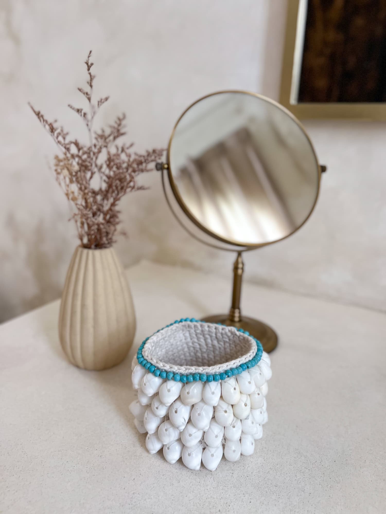 Its neutral tones and beach-inspired style make it a lovely accent for boho interiors. Use it to organize your earrings, bracelets, or rings, or simply as a decorative touch in your bedroom or bathroom. A natural, handmade piece that brings a little piece of Bali into your home.
